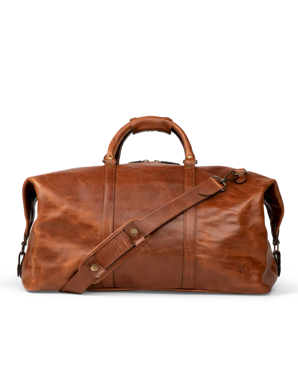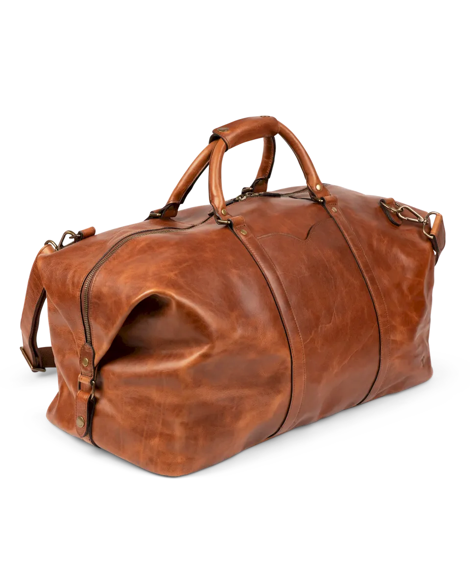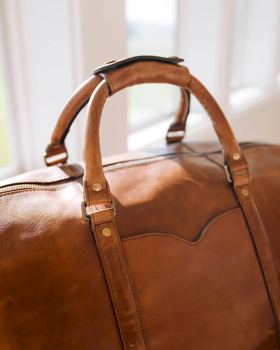 Designed for those who demand both style and substance, the Bartlett Large Weekender is built to withstand a lifetime of travel. Crafted from 100% natural grain cowhide, it showcases a rich depth of color and natural patina that deepens beautifully over time. This rugged leather, chosen for its durability and character, features a subtle pull-up effect, adding a unique dimension to its finish. Every detail of this heirloom-quality bag is designed for function and built to last. Reinforced with solid brass hardware, it features a premium two-way metal zipper for effortless access to the main compartment. The interior is lined with sturdy, water-resistant duck canvas—ensuring protection against the elements—while multiple pockets, including exterior front and rear slip pockets, interior zipper and slip pockets, and an interior key clip, keep essentials organized.