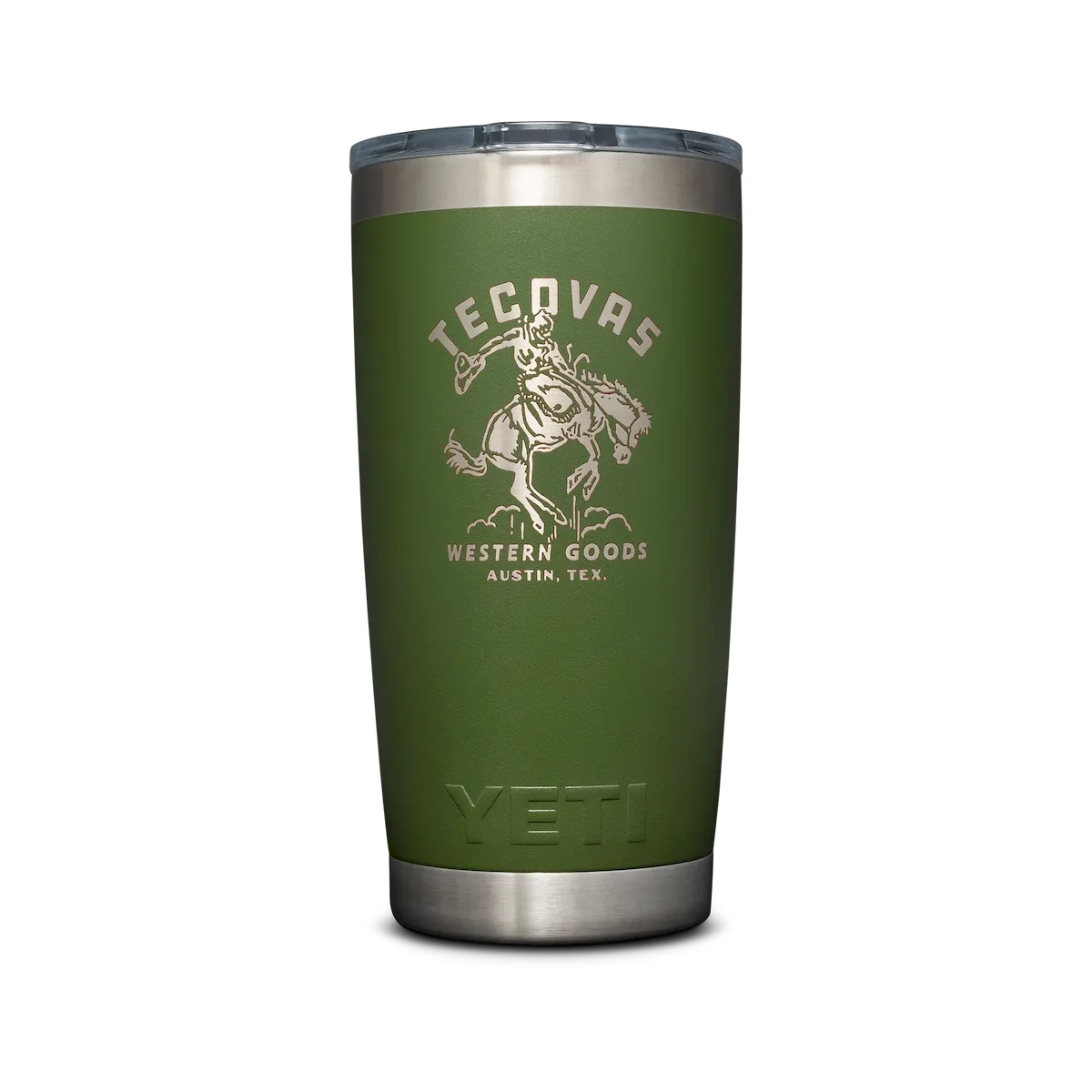 The Rambler® 20 oz. Tumbler is the ideal drinking companion from our friends at YETI and this custom tumbler features original Tecovas Western Goods artwork that will carry the spirit of the west all while keeping your drink cold or hot. The Tumbler and included MagSlider™ Lid are dishwasher safe for easy cleaning. Available in a new seasonal Duracoat color called Highland Olive.