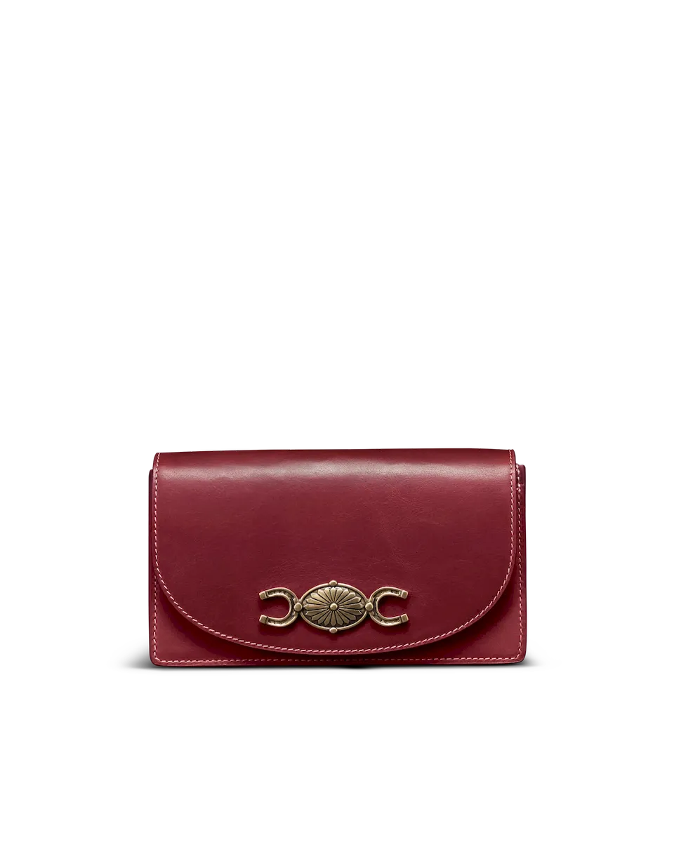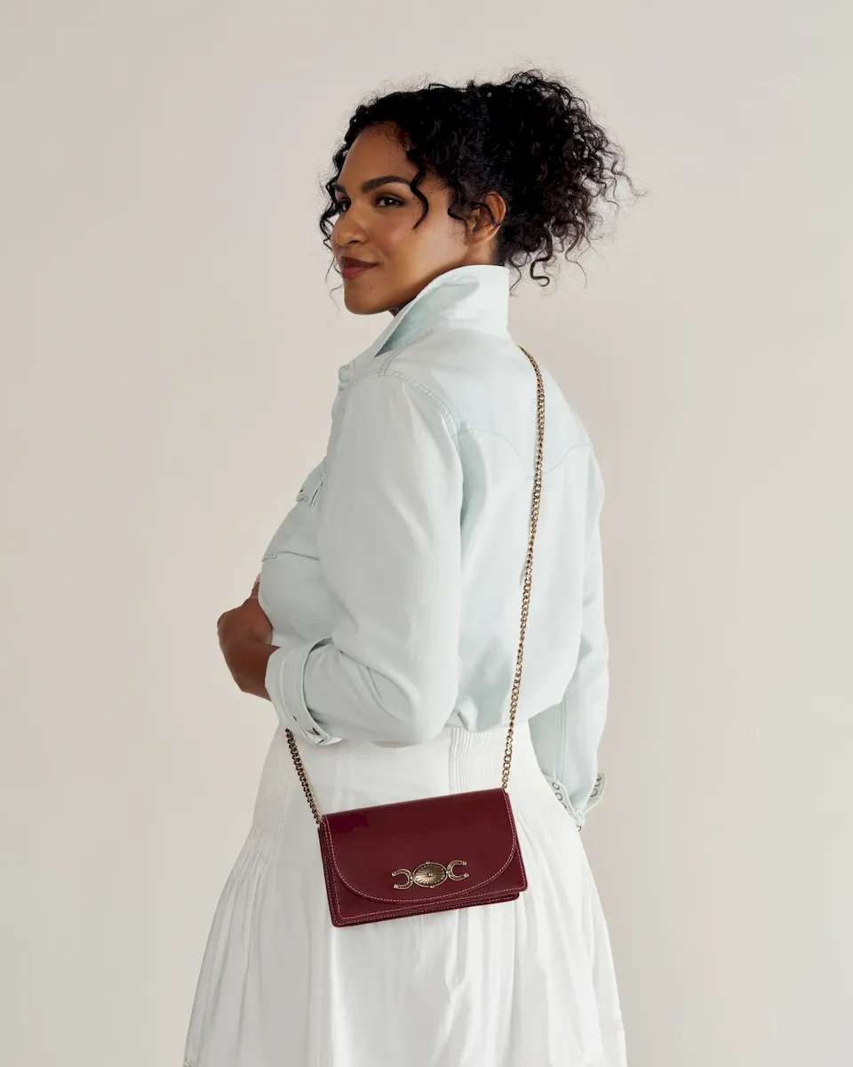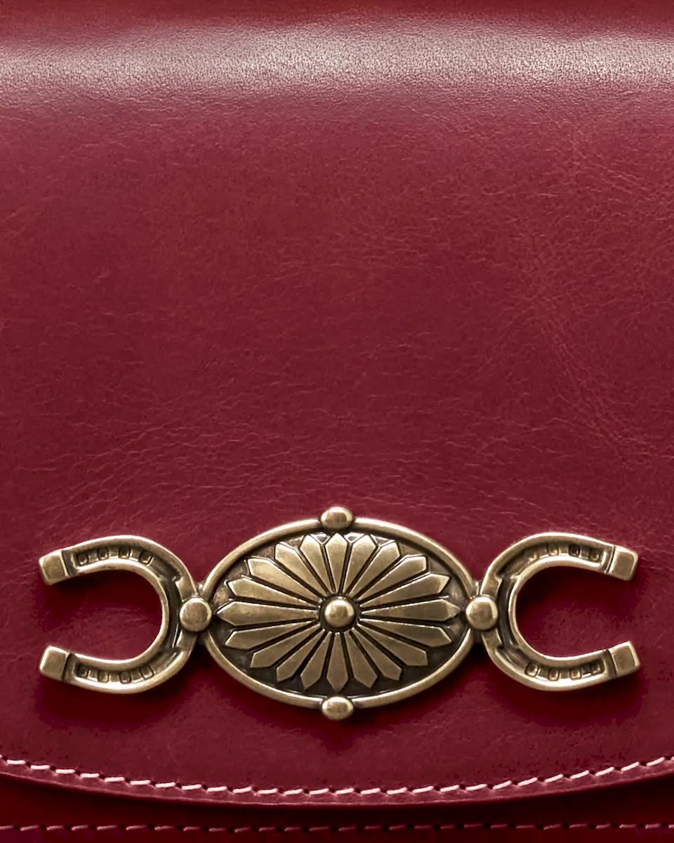 A compact statement piece with vintage character and modern ease, The Concho Chain Crossbody features a bold, custom concho and horseshoe medallion, paired with a sleek, minimal silhouette. With just enough room for your essentials and a removable chain strap, it’s your go-to for understated polish with a nod to classic Americana.