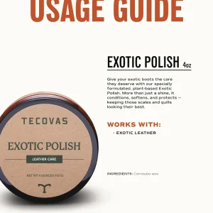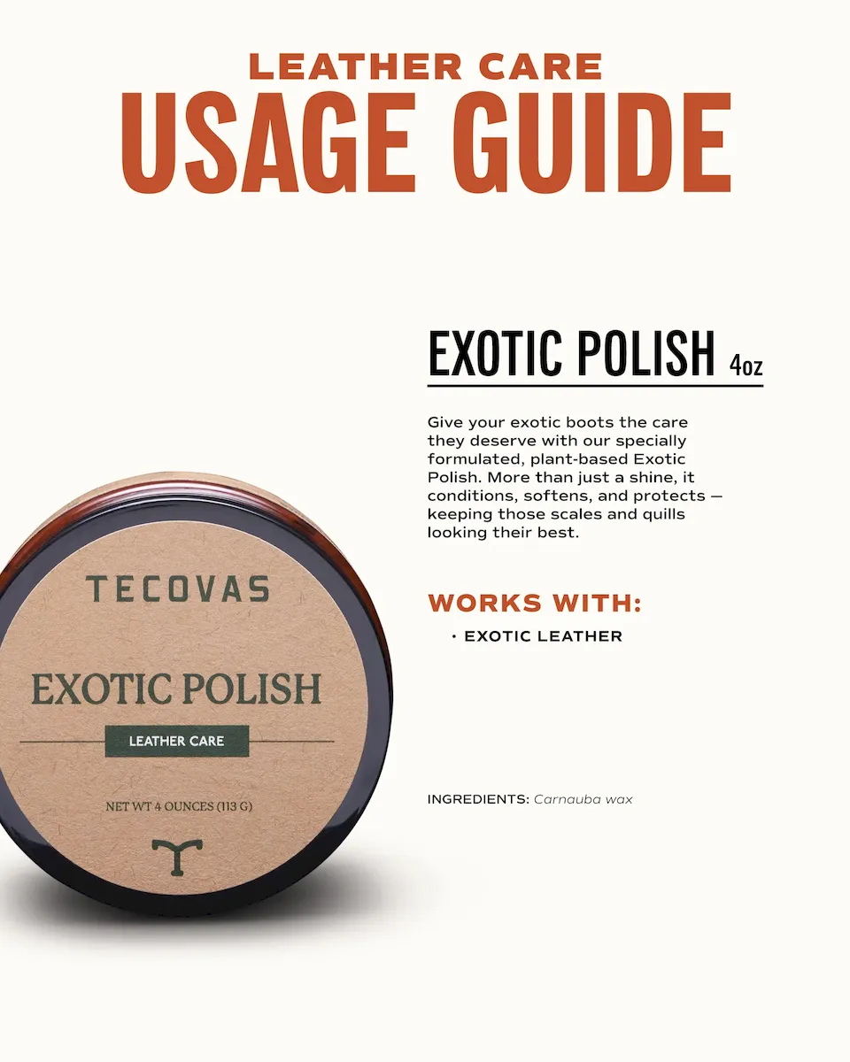Give your exotic boot’s scales and quills the care they deserve with our specially formulated Exotic Polish made with plant-based ingredients. This polish does more than add shine — it’s a top pick to condition, soften, and protect.