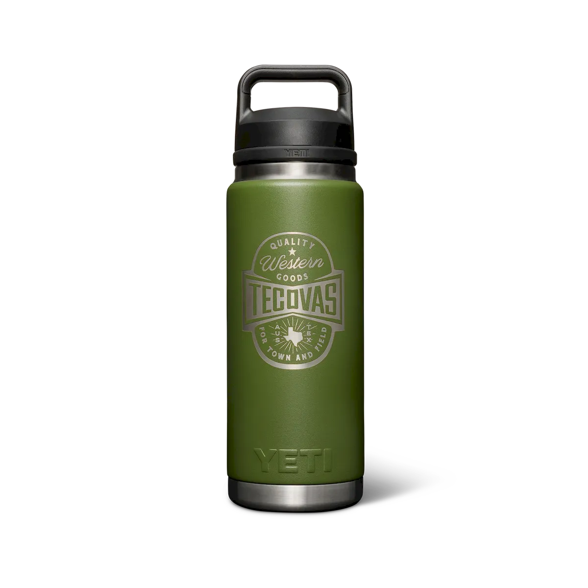 The For Town & Field 26 oz. Water Bottle from our friends at YETI makes sipping all the more satisfying. This limited edition showcases our original Tecovas Western Goods artwork. Functional features abound: 100% leak-proof chug cap for peace of mind, double-walled vacuum insulated for keeping drinks at the temperature you poured ‘em at, and dishwasher safe for easy cleaning.