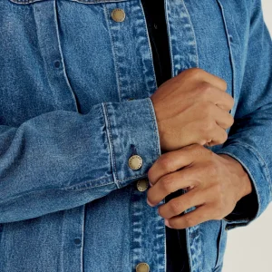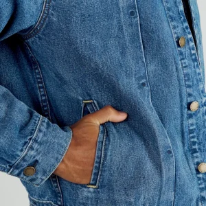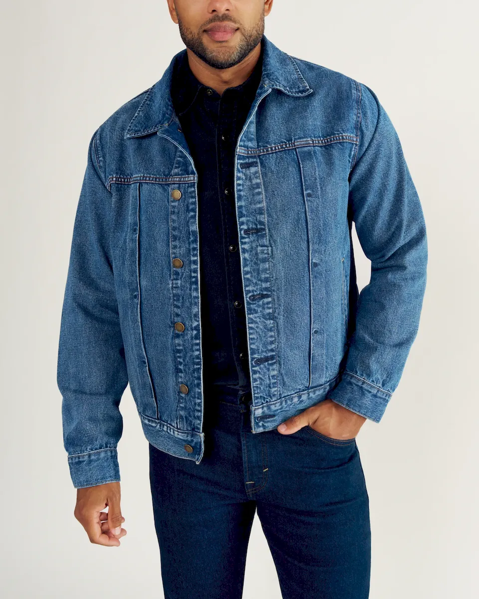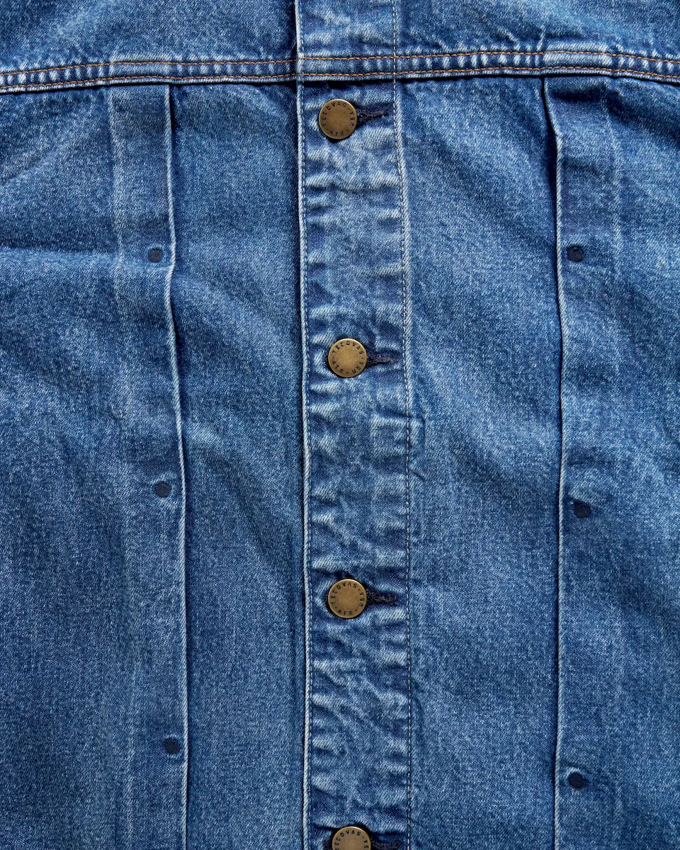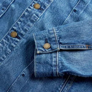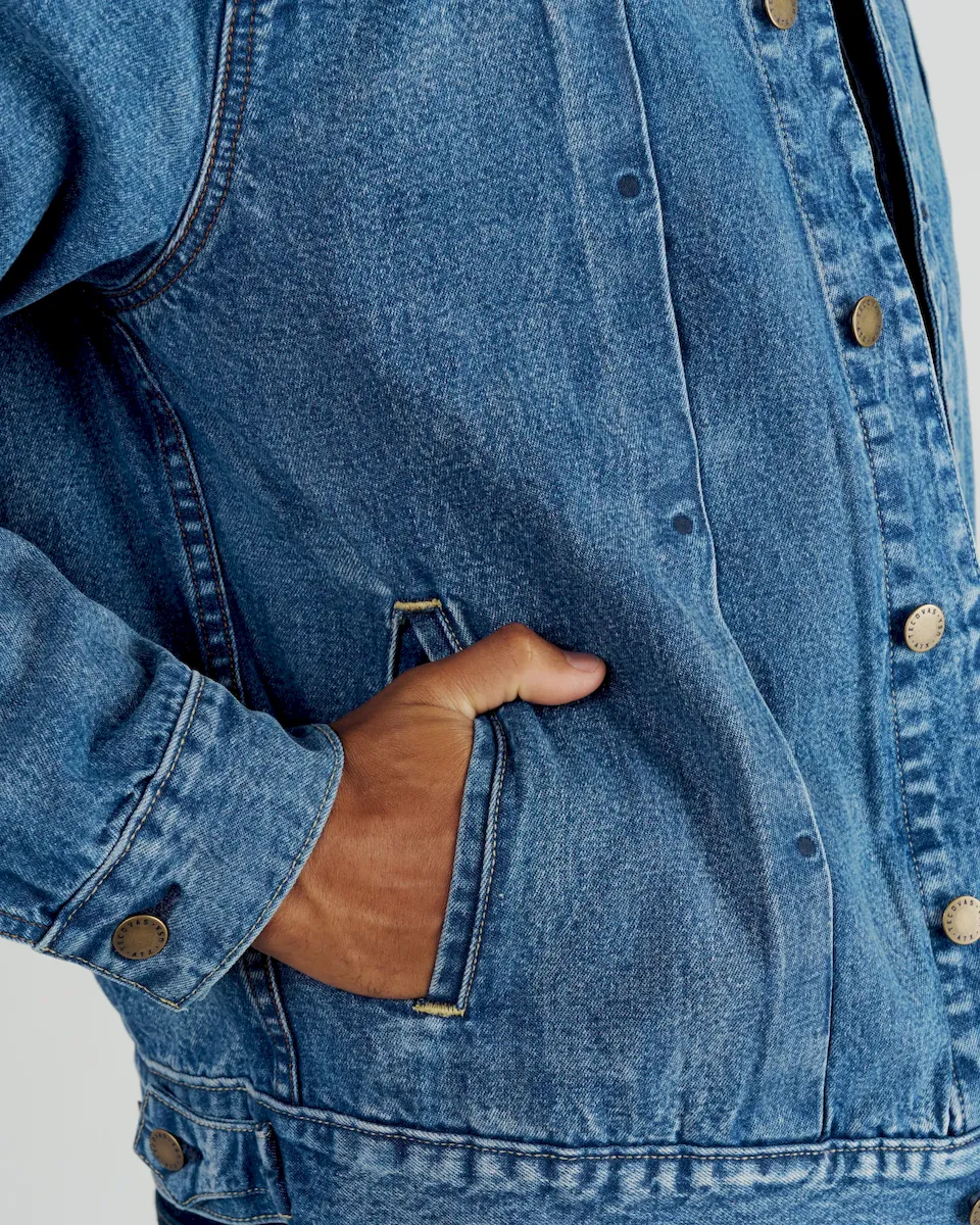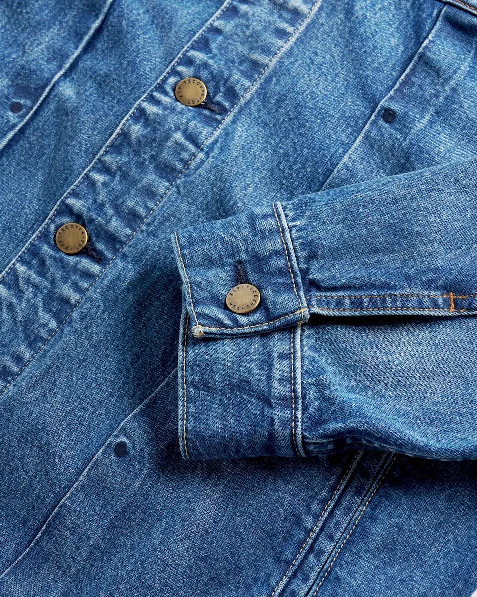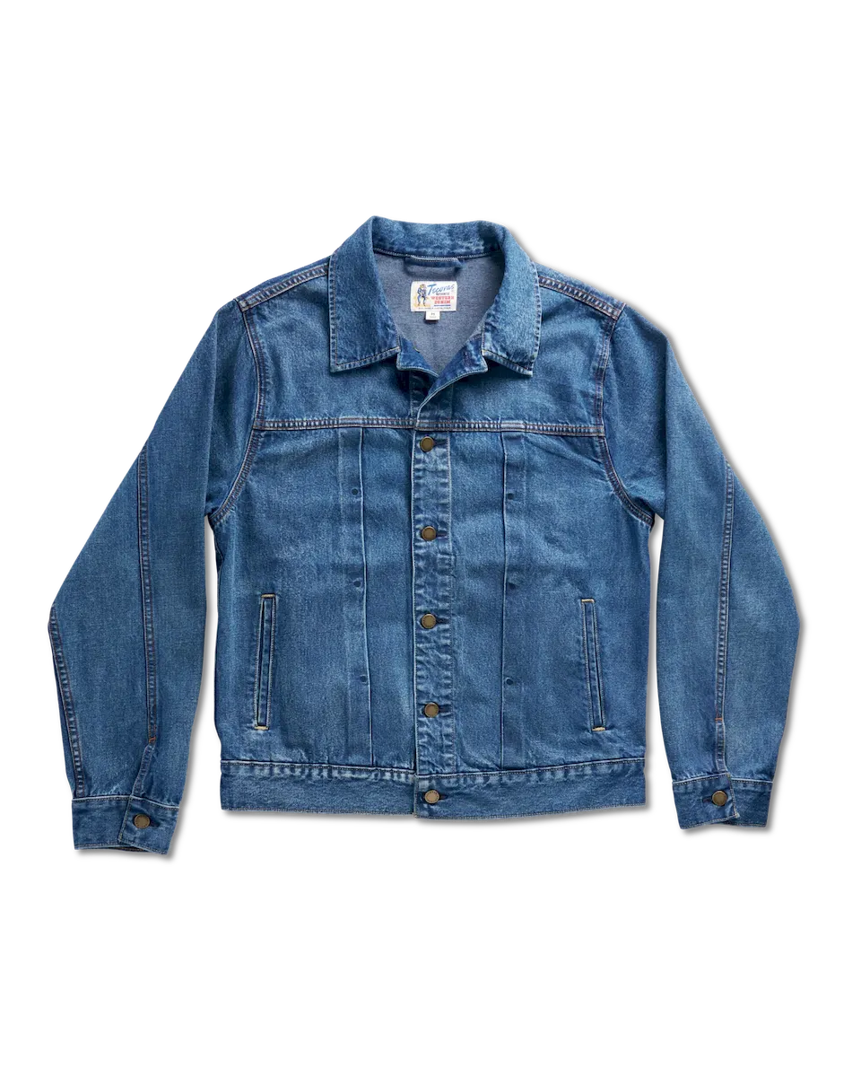 The Men’s Denim Ranch Hand Trucker is a masterclass in Western style, crafted from premium midweight denim spun at the iconic Cone Mill. Its rope-dyed indigo with a subtle grey fill gives the jacket a unique, vintage-inspired patina right from the start. Designed with classic Western details, it features front pleats and bi-swing back construction for effortless movement, while the custom Flying-T back yoke adds signature style.. Circular embroidered rivets line the front pleats—a nod to legendary rodeo jackets that have stood the test of time. Pair it with a tee and cowboy boots, and ride easy.