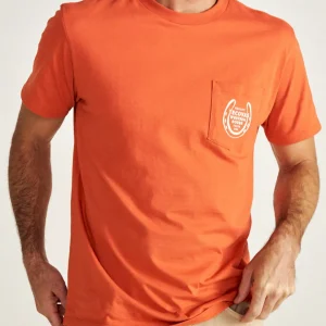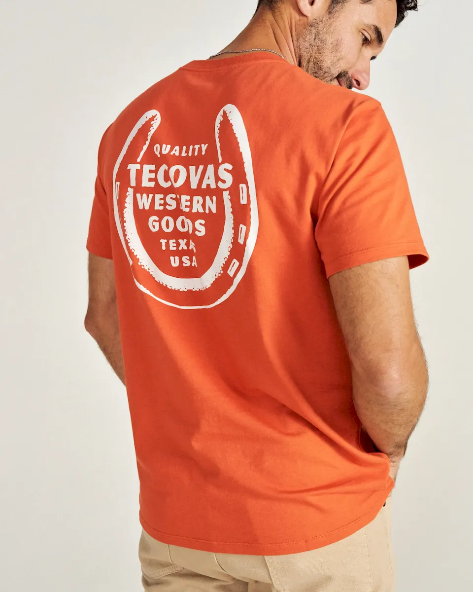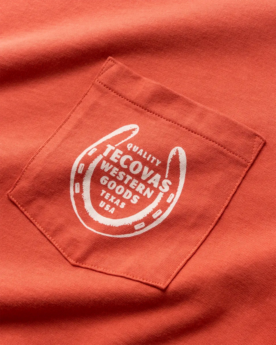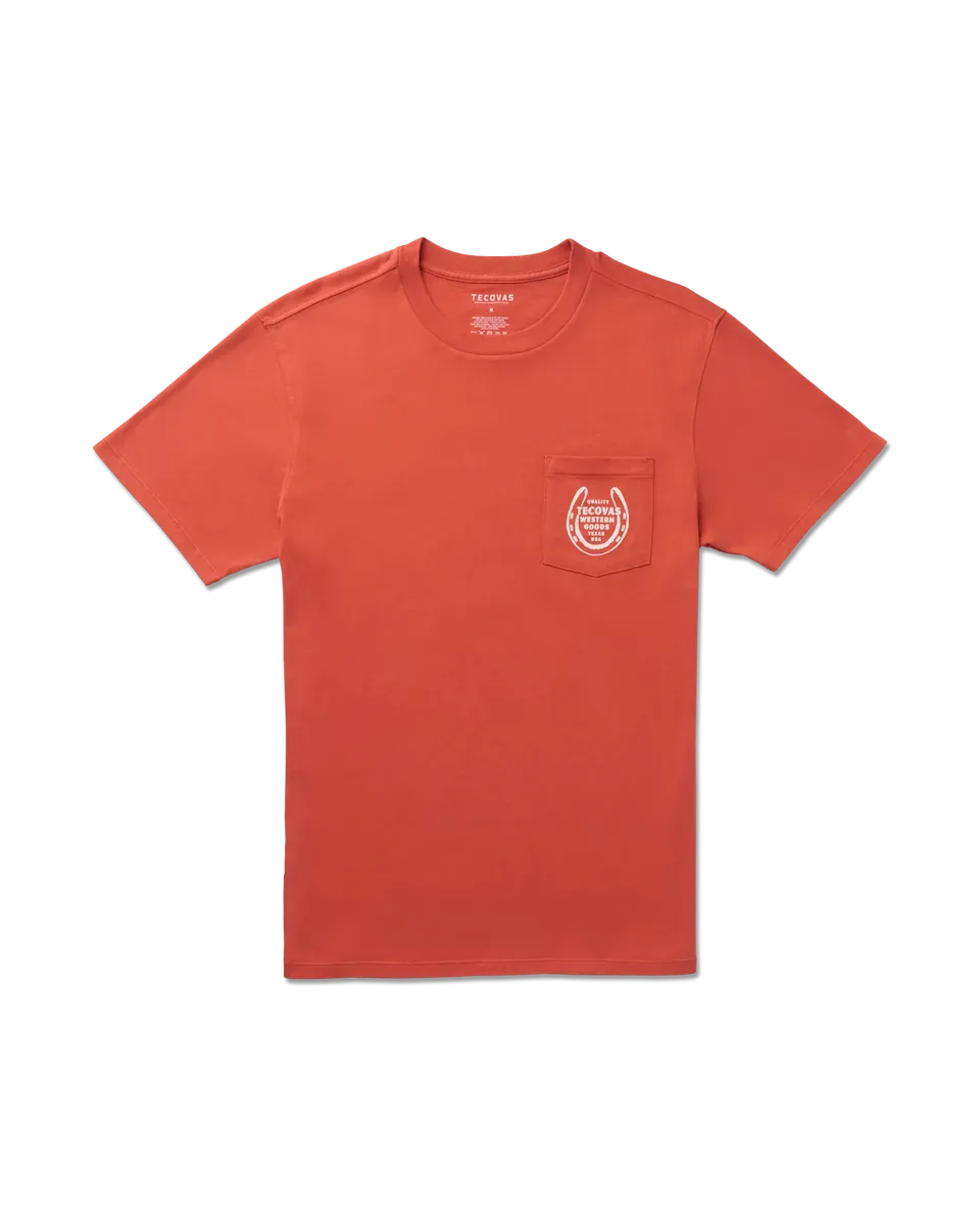 Every cowboy needs a lucky shirt. Our Horseshoe Pocket Tee is made from an ultra-soft and smooth Pima Cotton blend. A classic horseshoe graphic illustration, front pocket, and standard fit make this an easy tee to throw on and head out in.