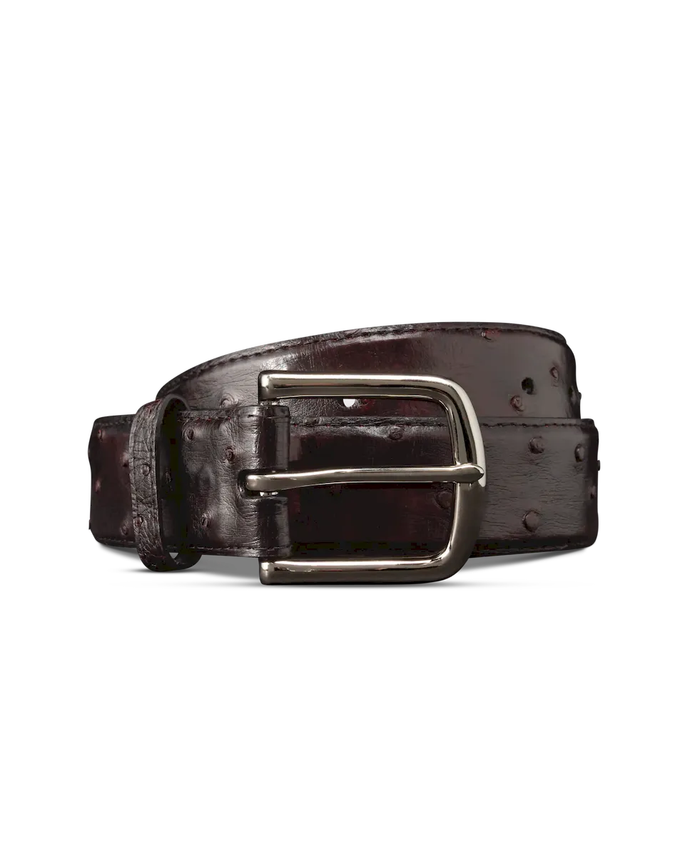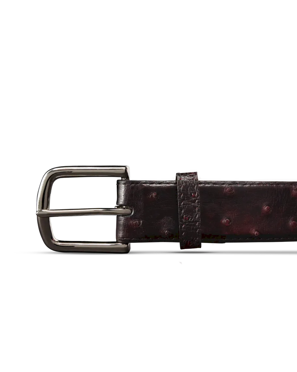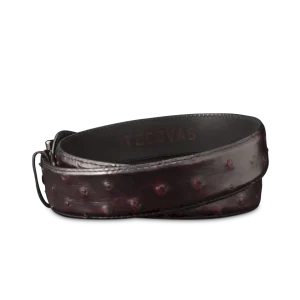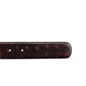 Crafted from full-quill ostrich leather in a deep Black Cherry hue, this belt showcases striking texture and natural pattern variation. Finished with a classic nickel-plated buckle and built to match your finest Black Cherry boots.