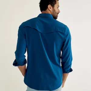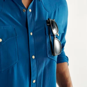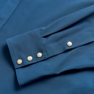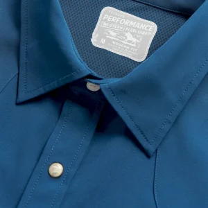 Made with a moisture-wicking polyester/spandex blend with plenty of stretch and wrinkle resistance, this garment is a sun specialist with a UPF50+ rating. It features a ventilated back yoke for extra breathability. Additional hot weather adaptations include a hidden sunglass wipe on the interior placket and a slot to stow your sunglasses on the chest pocket. It makes looking good easy with twin front pockets featuring subtle T-Brand detailing, all secured with antique brass-accented faux horn pearl snaps.