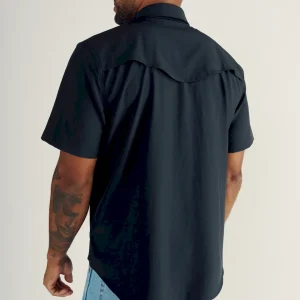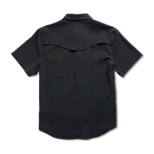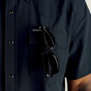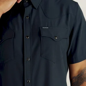 Made with a moisture-wicking polyester/spandex blend with plenty of stretch and wrinkle resistance. A sun specialist with a UPF50+ rating, it features a ventilated back yoke for extra breathability. More hot weather adaptations: a hidden sunglass wipe on the interior placket and a slot to stow your sunglasses on the chest pocket. It makes looking good look easy with twin front pockets with subtle T-Brand detailing, all secured with antique brass-accented faux horn pearl snaps.