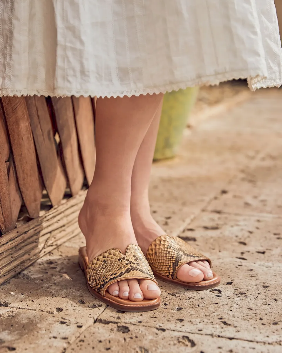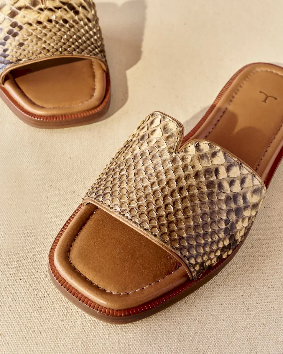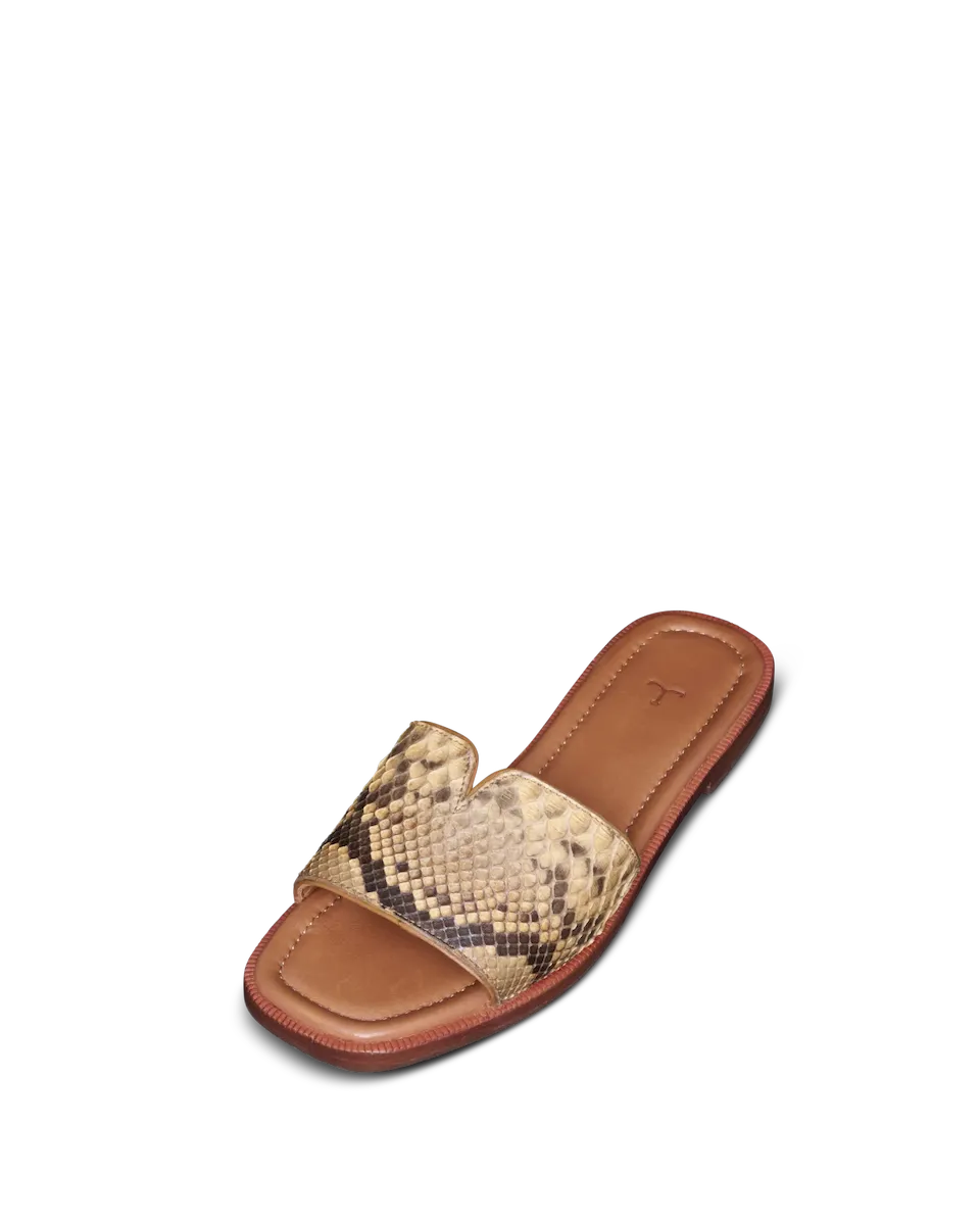 Meet The Carmen, a fashion sandal with a distinctly Western look and feel. Here in a variety of distinct exotic hides, its wide vamp strap has a subtle Western scallop that also gives it a natural flex point for added comfort in each step. A soft square toe accommodates many foot widths, and micro-piping rounds to the Western details. It’s handcrafted in time-honored tradition by way of a stitched, rolled-welt, the insole of which is padded and lined with breathable cowhide. Its leather outsole features a slim rubber sole saver for grip and durability.