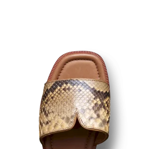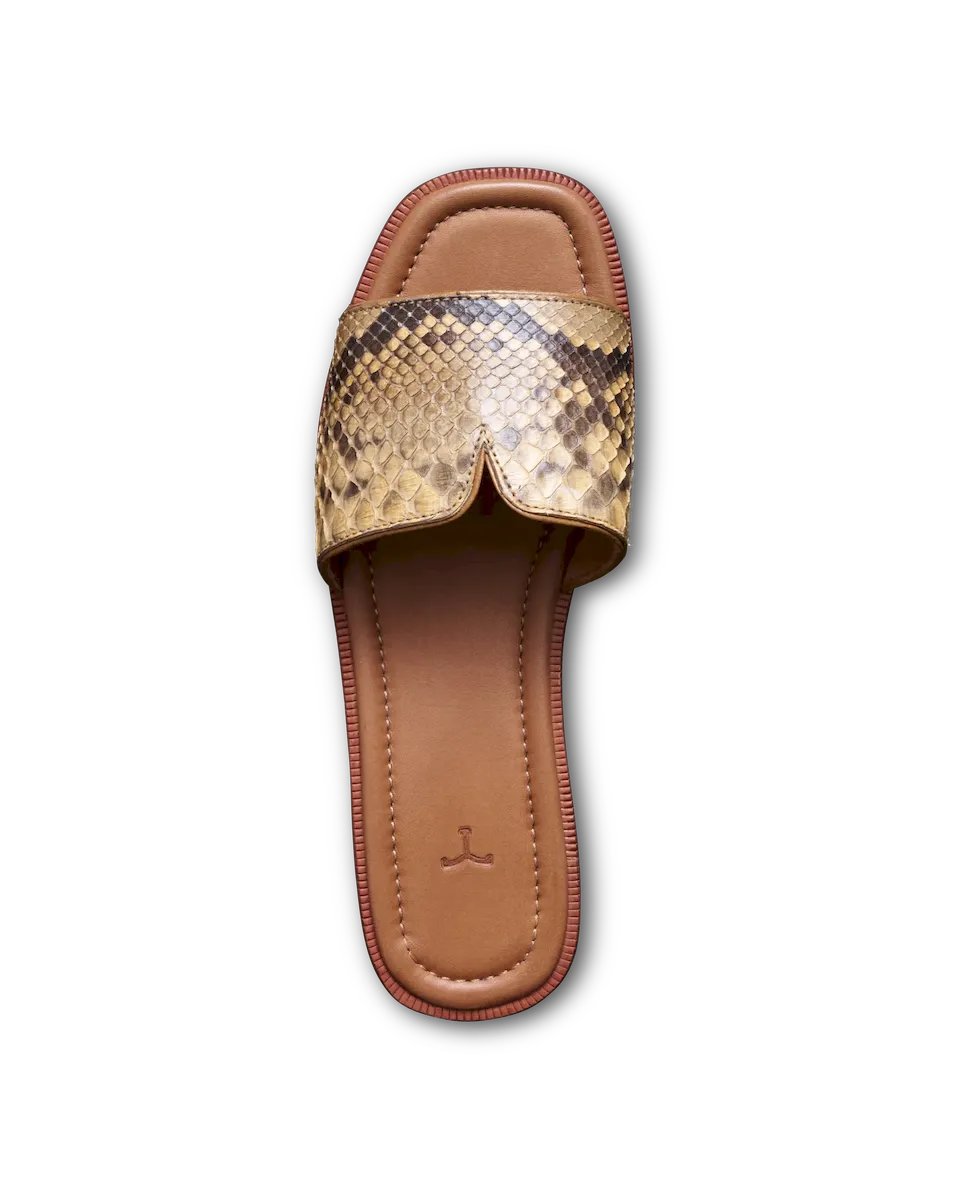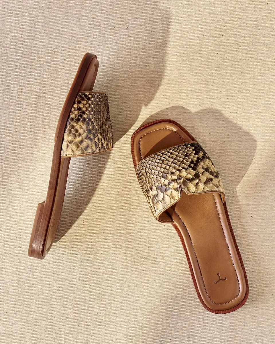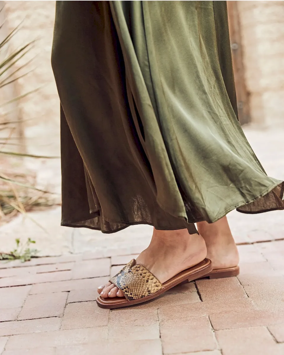 Meet The Carmen, a fashion sandal with a distinctly Western look and feel. Here in a variety of distinct exotic hides, its wide vamp strap has a subtle Western scallop that also gives it a natural flex point for added comfort in each step. A soft square toe accommodates many foot widths, and micro-piping rounds to the Western details. It’s handcrafted in time-honored tradition by way of a stitched, rolled-welt, the insole of which is padded and lined with breathable cowhide. Its leather outsole features a slim rubber sole saver for grip and durability.