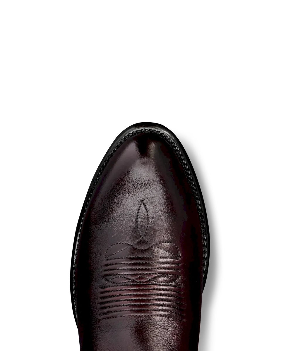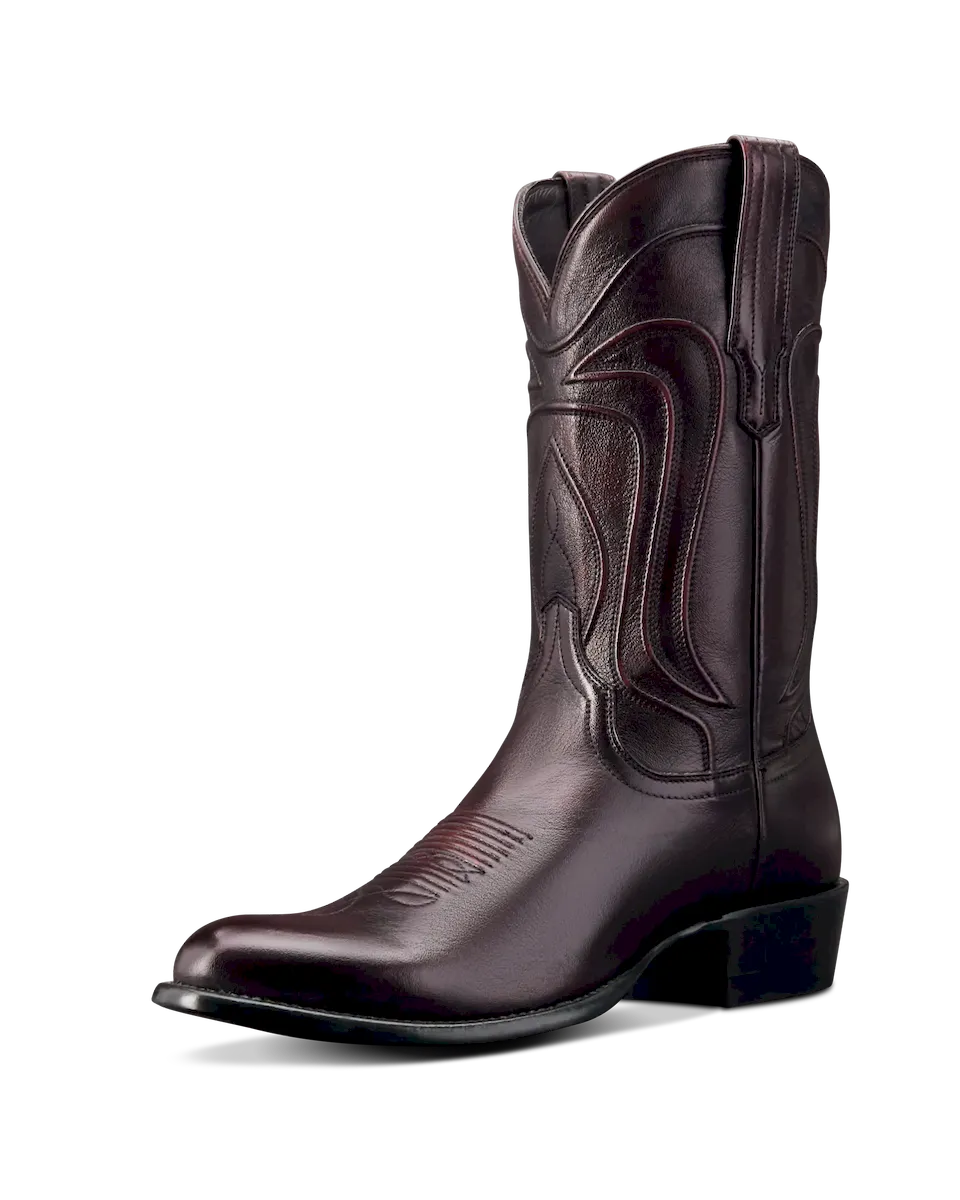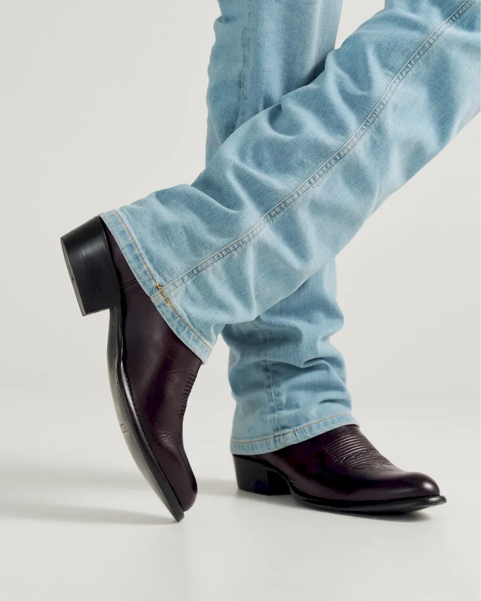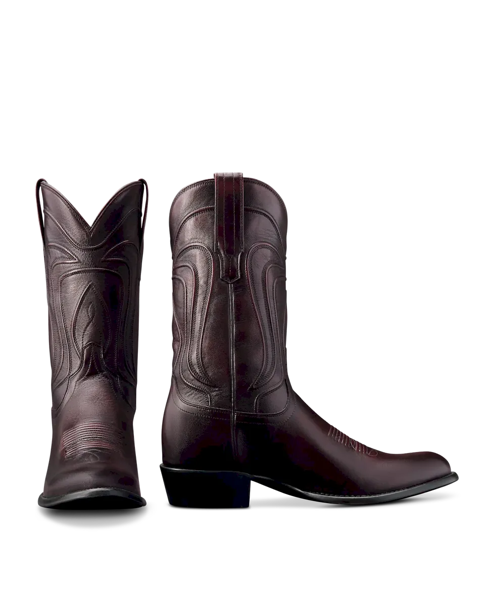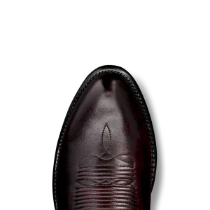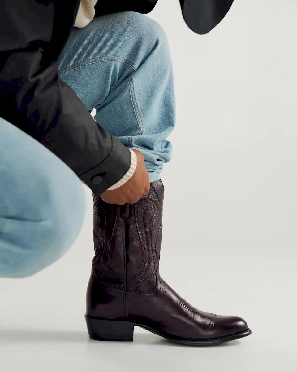 The Cartwright steps out in a bold new colorway—featuring a Black Cherry cowhide shaft made from brushoff leather that reveals more vibrant cherry tones the more you wear it. Paired with a classic round toe, 1½” angled heel, and signature Tecovas toe stitching, it’s a timeless silhouette with a striking finish. The deep red hue makes it easy to dress up or down—refined enough for a wedding, rugged enough for a night out.