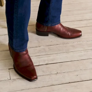 The Jack is a timeless Western zip boot made for the stage. Our signature cowboy cutter toe leads with attitude and a subtle inside zipper makes it easy to pull on and great for those who want to rock them under a slimmer pant leg. A tasteful dip top shaft design and a double-row stitching pattern complete its refined look. Beyond that, it’s purely constructed with a ¾ Goodyear welt, leather sole, and stacked leather heel that brings all the quality and comfort you should count on in a fine dress boot.