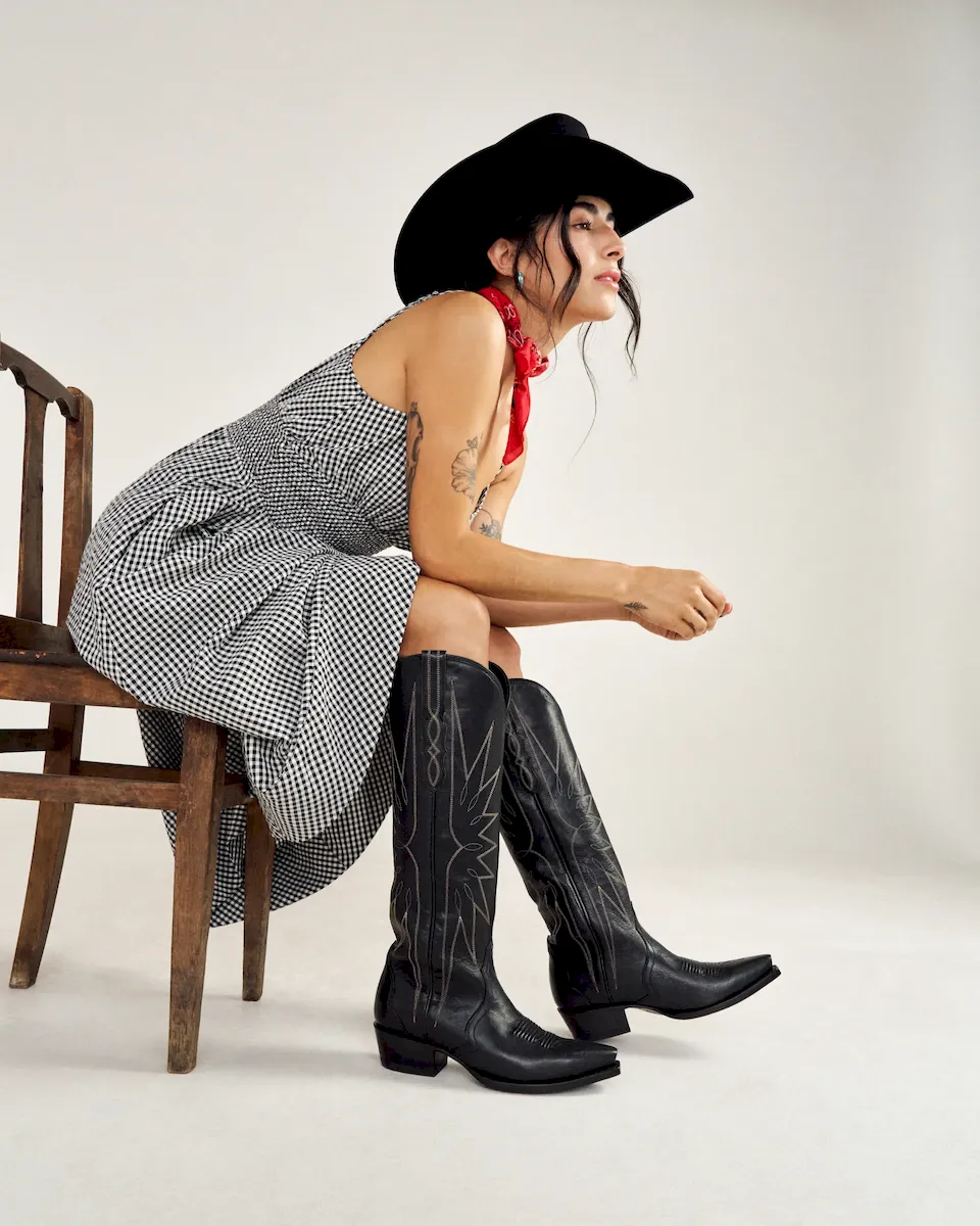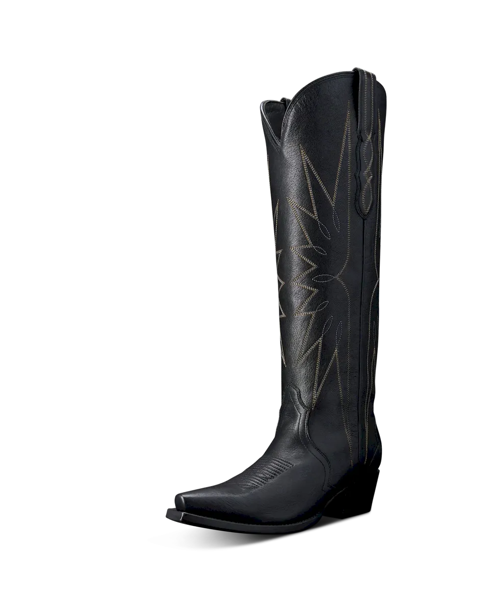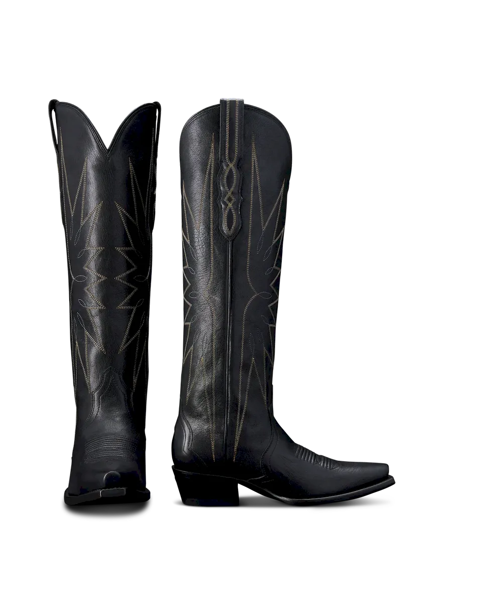 A tall showstopper, The Loretta features an intricately stitched 17” shaft with hung leather lining and a streamlined modern profile that’s made to be shown off. A 1 ¾” stacked leather heel and snip toe ensure comfort doesn’t take a backseat to looks, and our signature toe bug takes it all the way West.