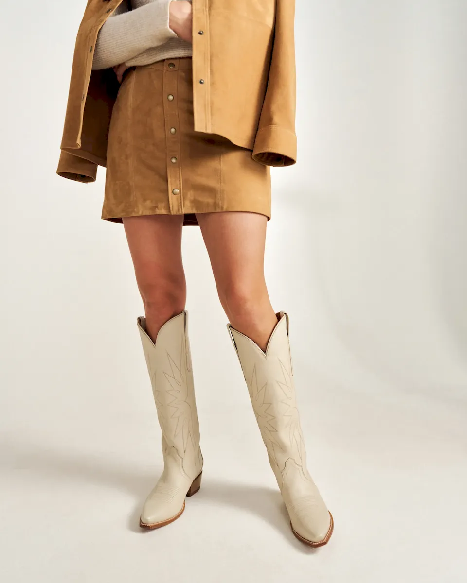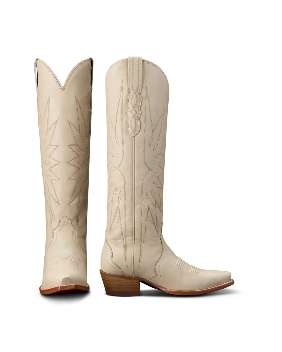 A tall showstopper, The Loretta features an intricately stitched 17” shaft with hung leather lining and a streamlined modern profile that’s made to be shown off. A 1 ¾” stacked leather heel and snip toe ensure comfort doesn’t take a backseat to looks, and our signature toe bug takes it all the way West.