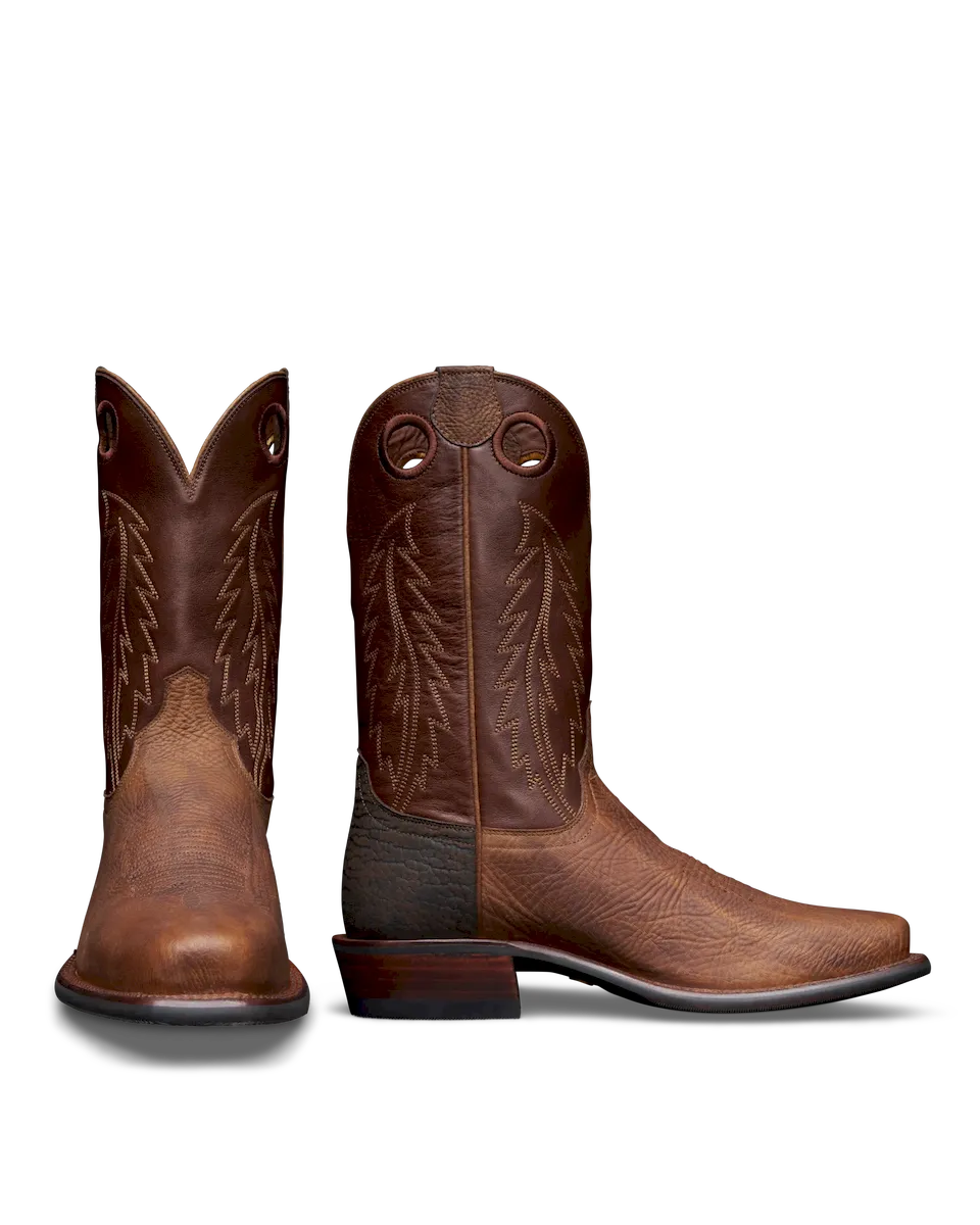 Available here in bullhide, roughout, and tumbled shrunken bison — all are equally tough with a slim Vibram outsole and rugged bullhide counter made to handle spurs. Its 1 ½” stacked leather heel is slightly pitched in the front for stirrup grip, and the back houses a 6/16” spur ledge. Inside, its dual-insole keeps things comfortable with a removable cushioned footbed.