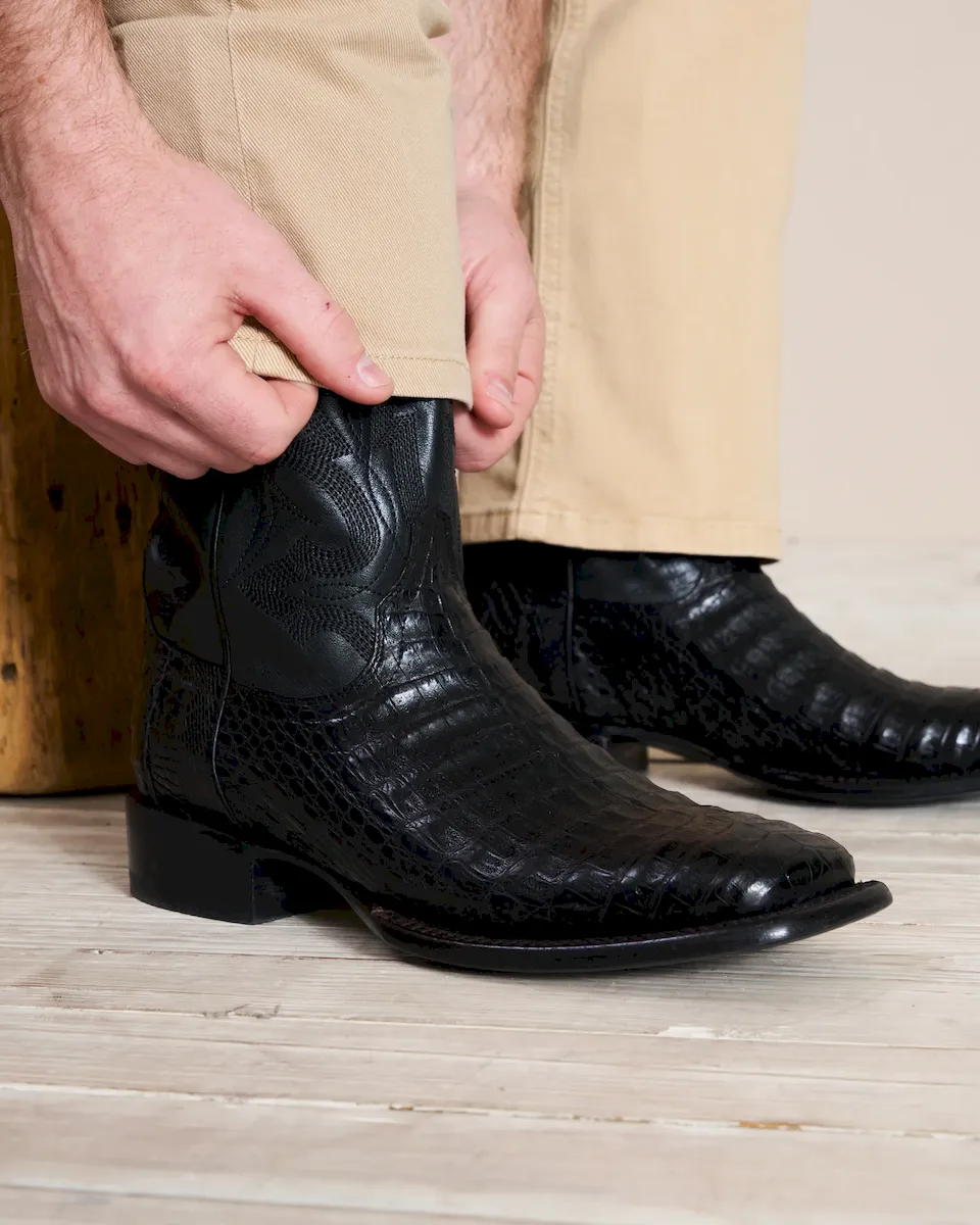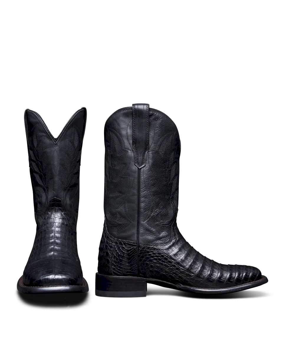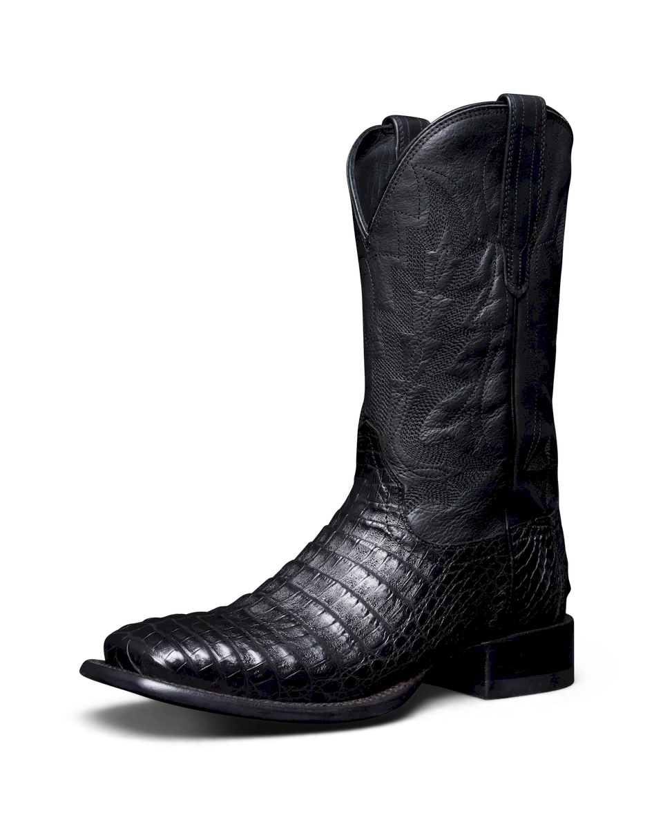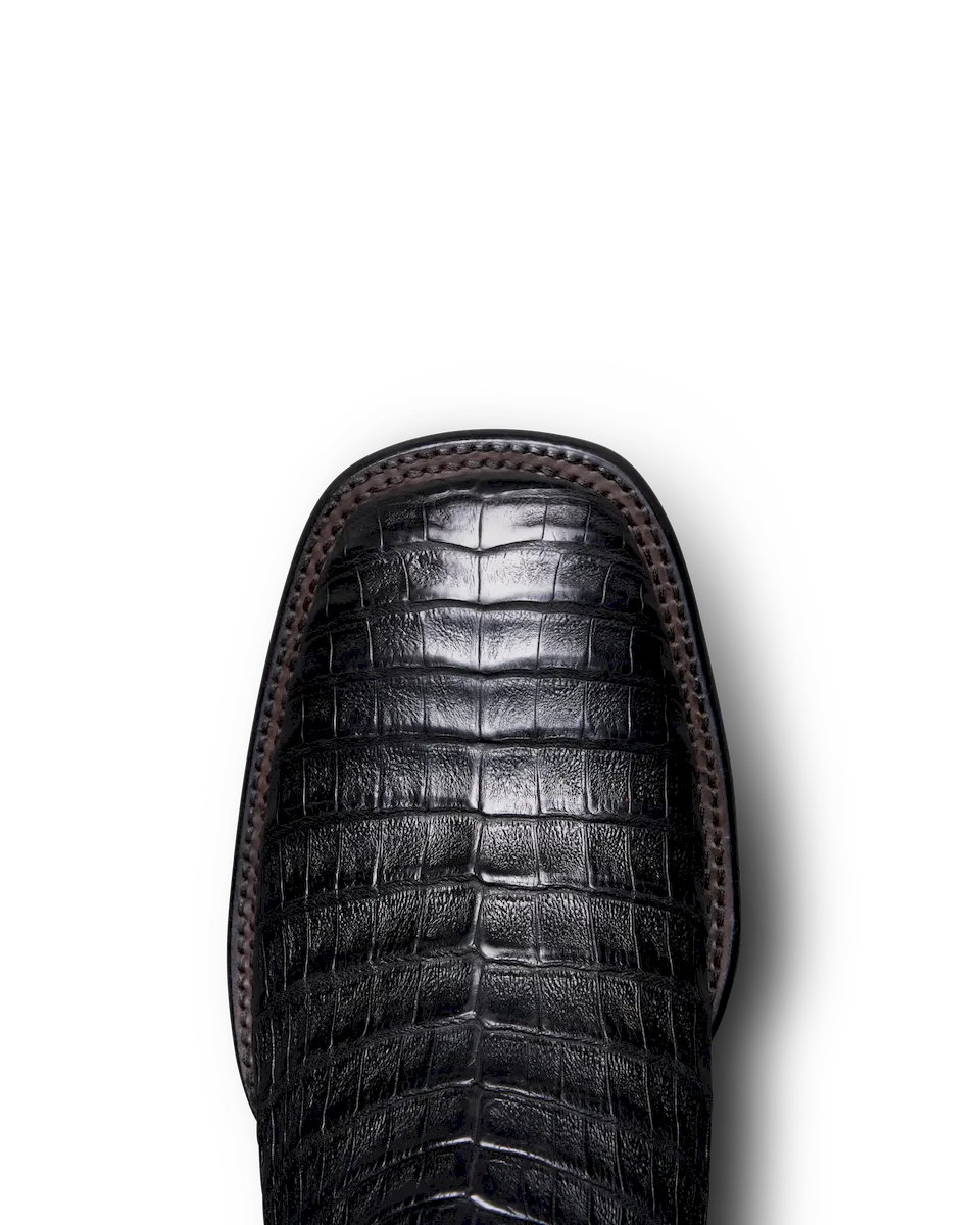 Striking caiman belly stars on our double-stitch welted broad square toe cowboy boot profile. Both refined and bold, no matter which handsome option you choose, The William has “Don’t Go Gently” attitude written all over it. A standout from top to toe, its 12” cowhide shaft features a stitched flame pattern design that cackles with personality. Pair them with dark denim and a tee or your finest sport coat — you make the rules.