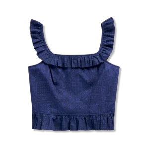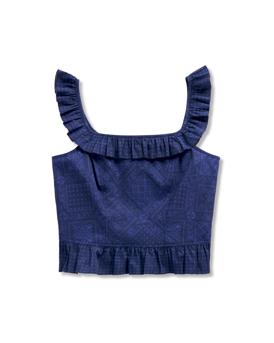 The Women’s Bandana Peplum Tank is designed for effortless style and comfort in spring and summer. Featuring ruffled straps with a delicate picot edge and custom print, this tank embraces thoughtful details. Smocking with corset details at the front provides added adjustability and increased mobility, while a bra-friendly strap with tab ensures a secure and flattering fit.