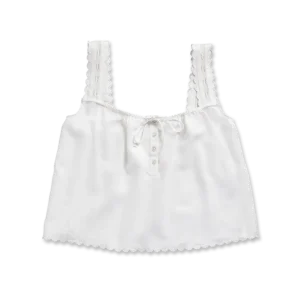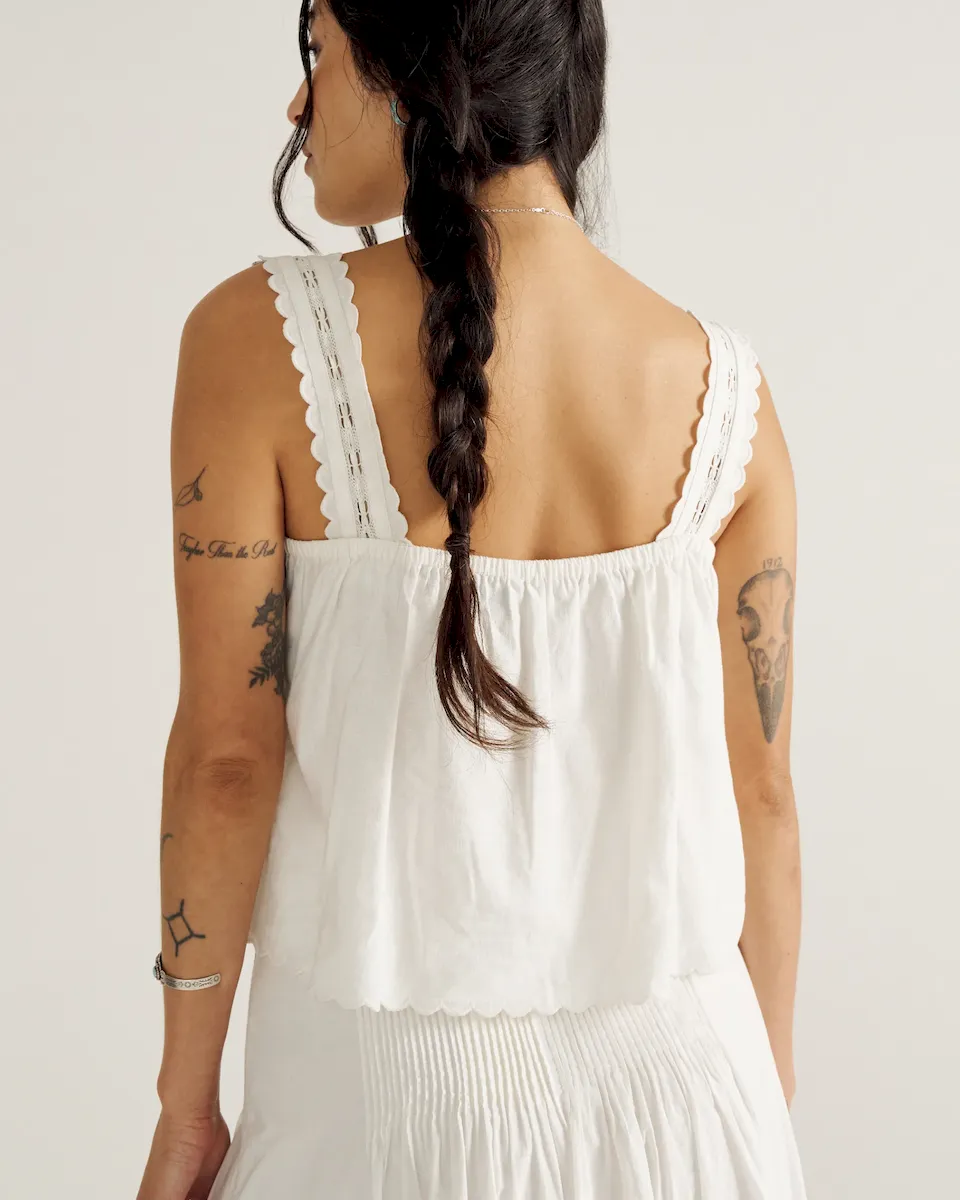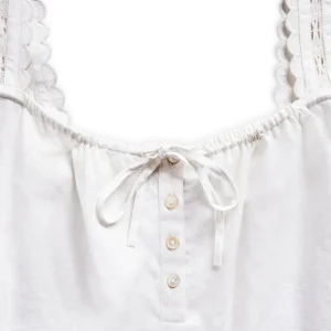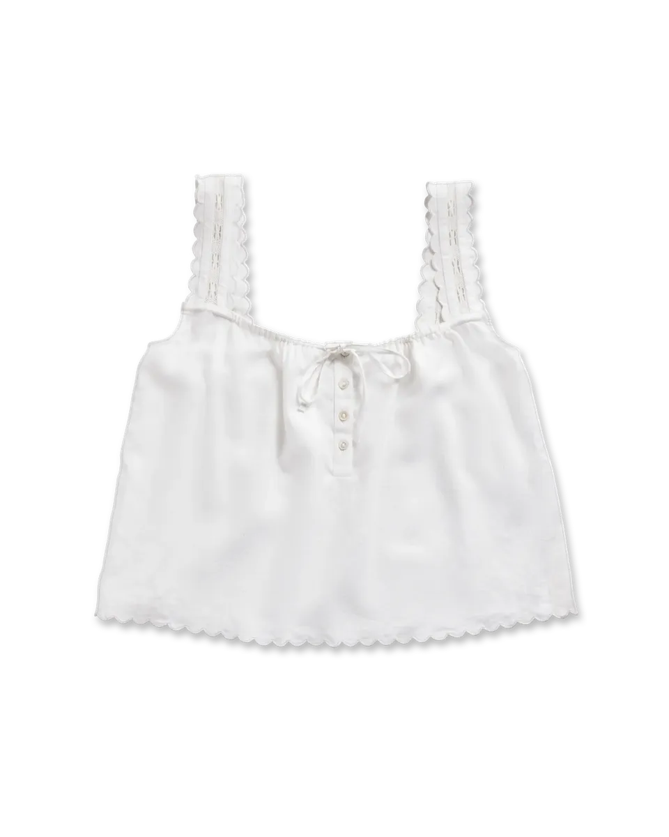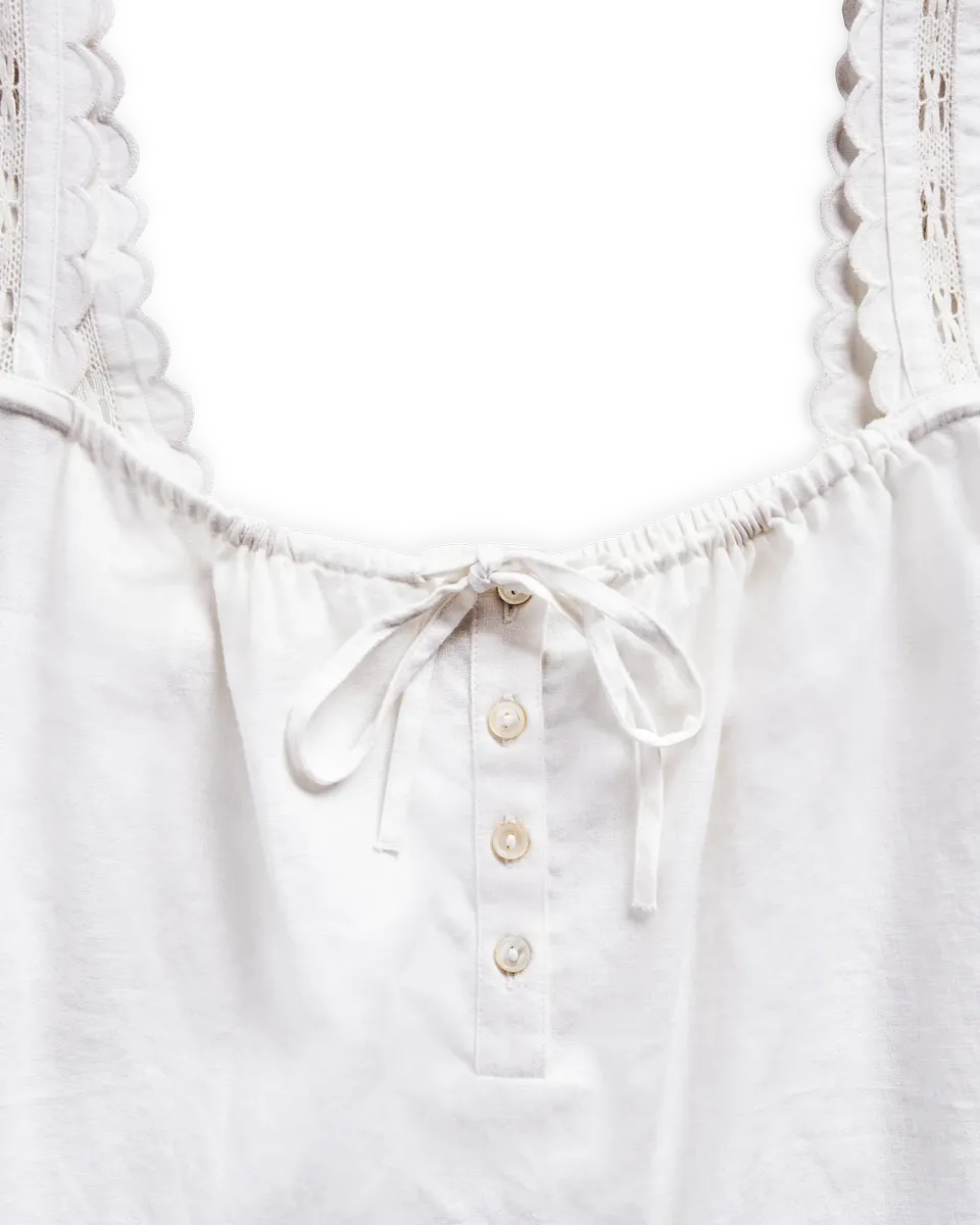 An elevated essential with artisanal details. Scalloped edges, delicate lace, and an adjustable neckline bring a refined touch, while the airy linen blend keeps it effortlessly breathable. Versatile, timeless, and made for sunlit days.