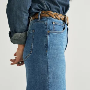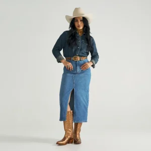 With a flattering front slit and just the right amount of stretch, this midi was made to show off your boots. Western-inspired details like a classic yoke, lasso stitching, and J-stitching add subtle character, while the medium wash keeps it easy to wear year-round. Pair it with the matching vest or make it the main event.