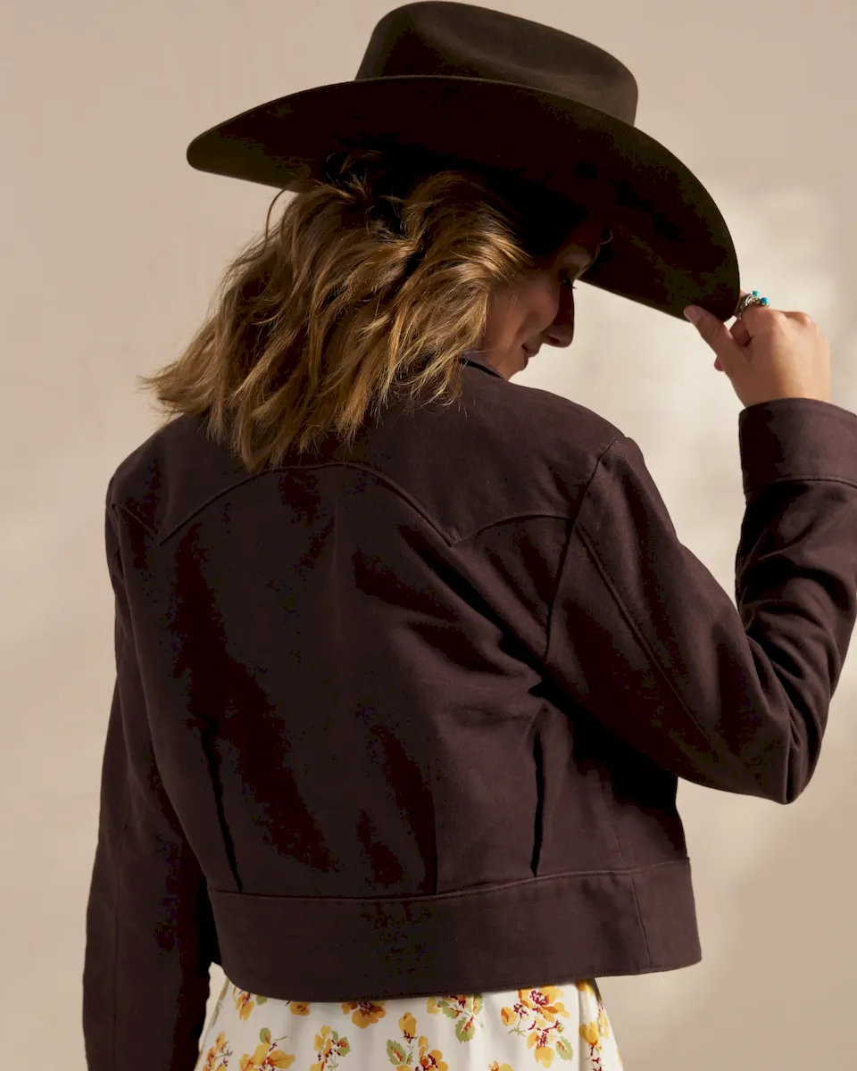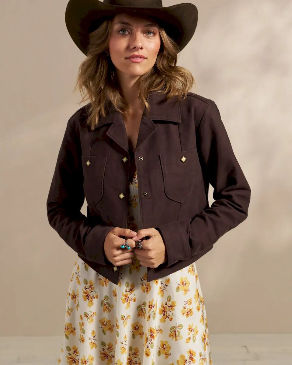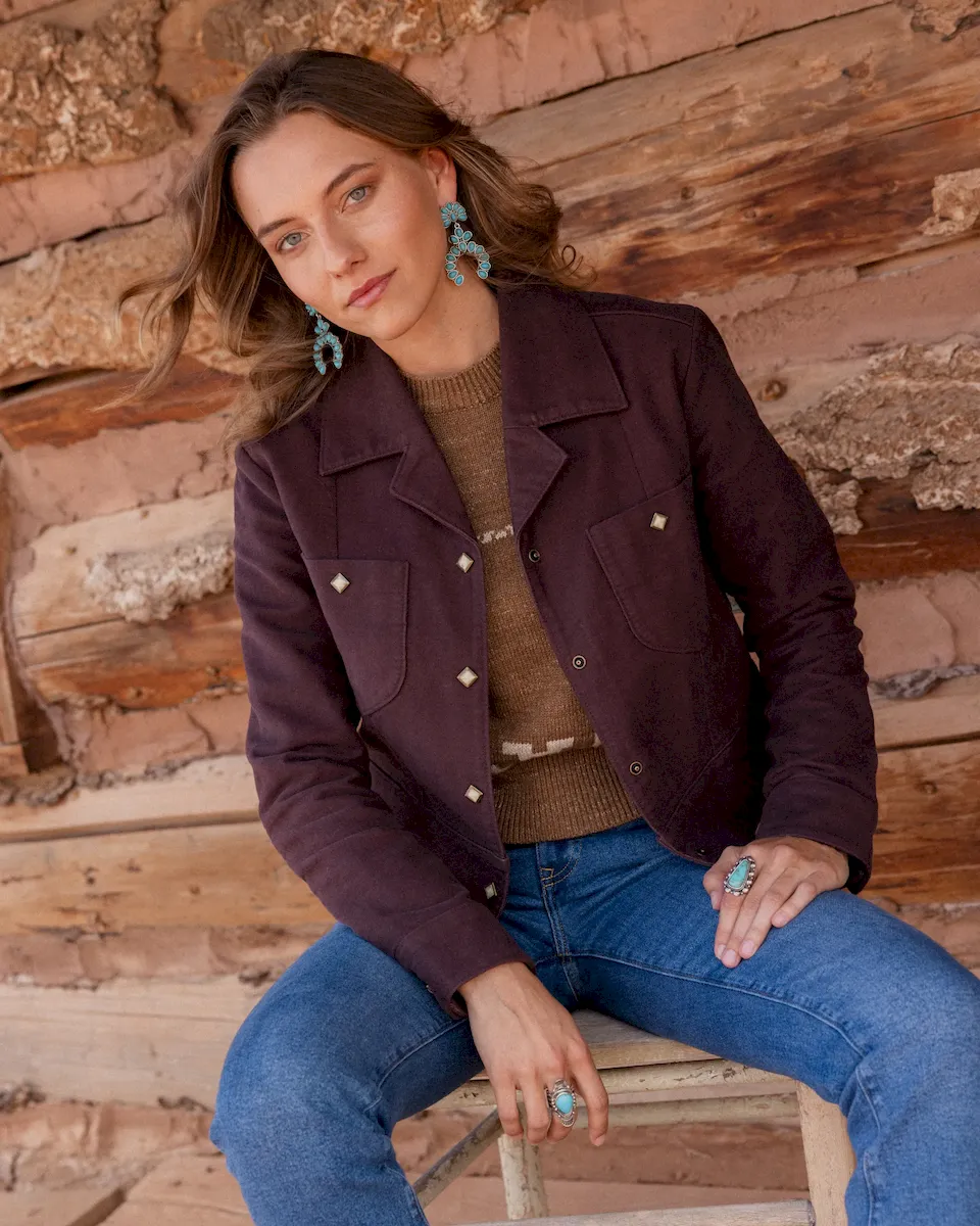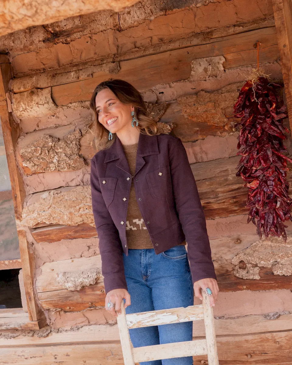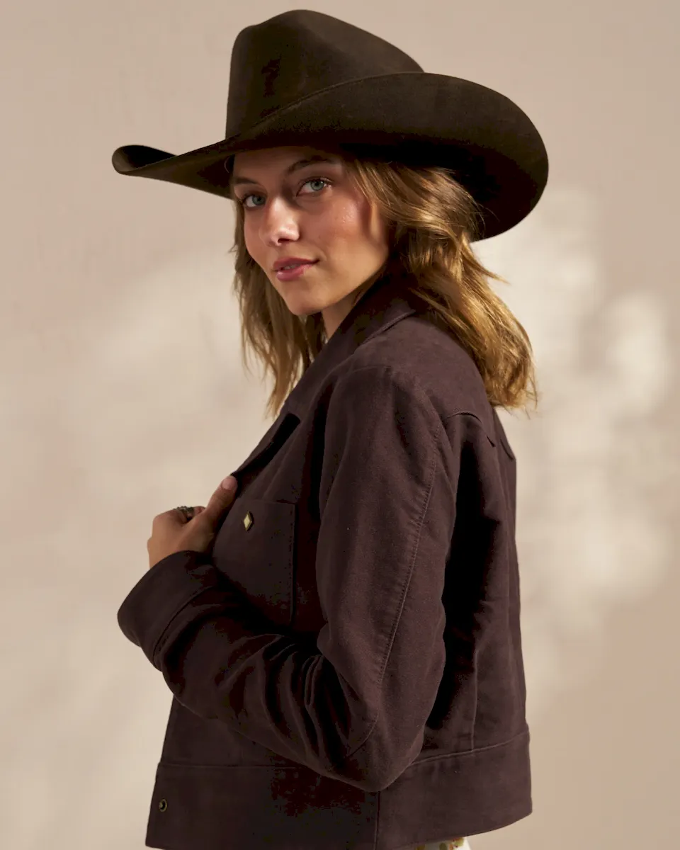 Soft, and lightweight, The Moleskin Pearl Snap Jacket is a versatile piece that will complement denim and also work as an additional layer on brisk evenings over a Western dress. A moderately cropped silhouette brings the vintage vibes and diamond-shaped, brass-accented pearl snaps only add to its nostalgic look and feel. Double-breast pockets, a pleated back, and a double-pointed yoke round out the Western details.