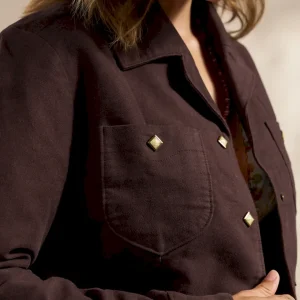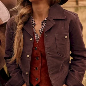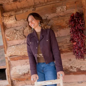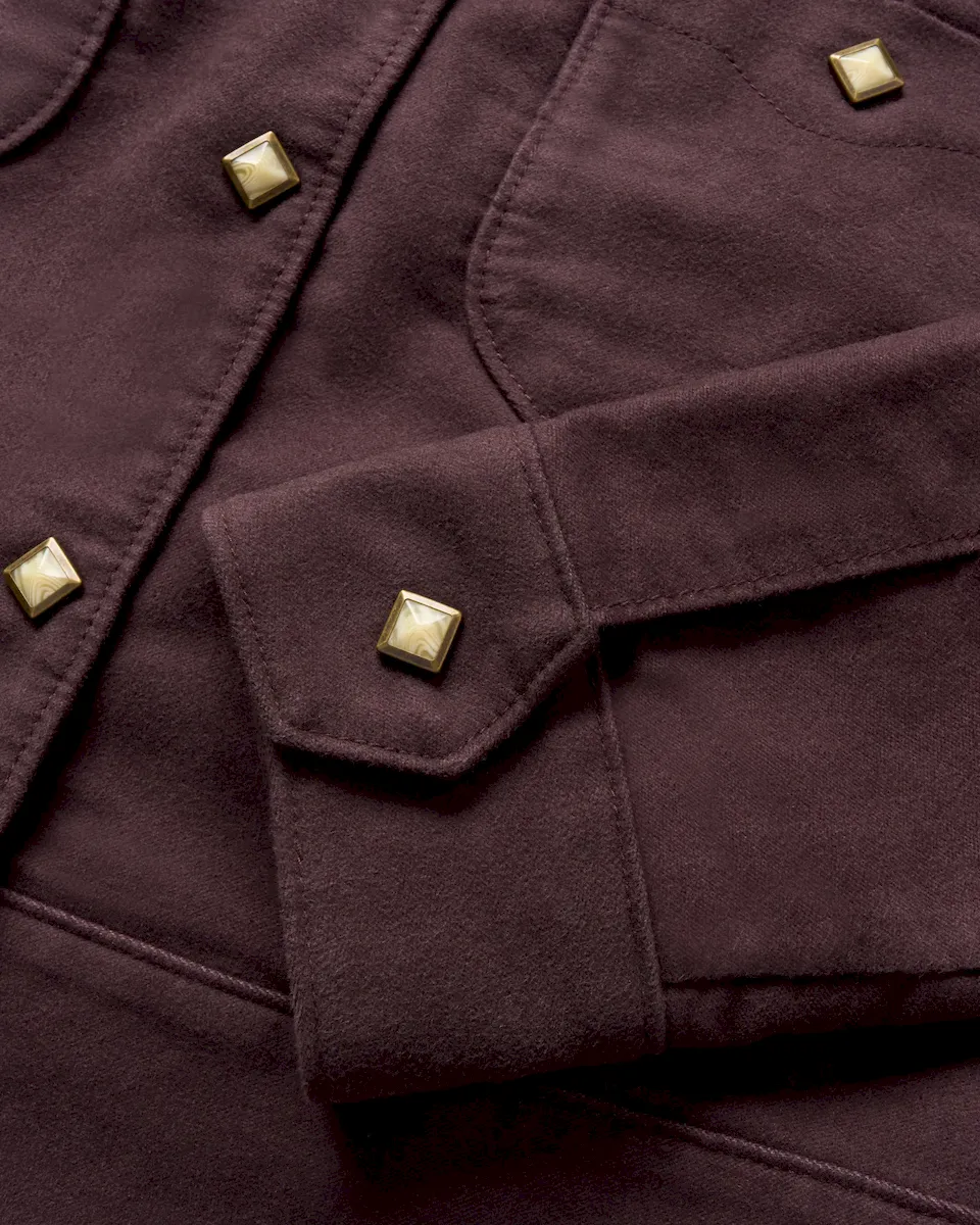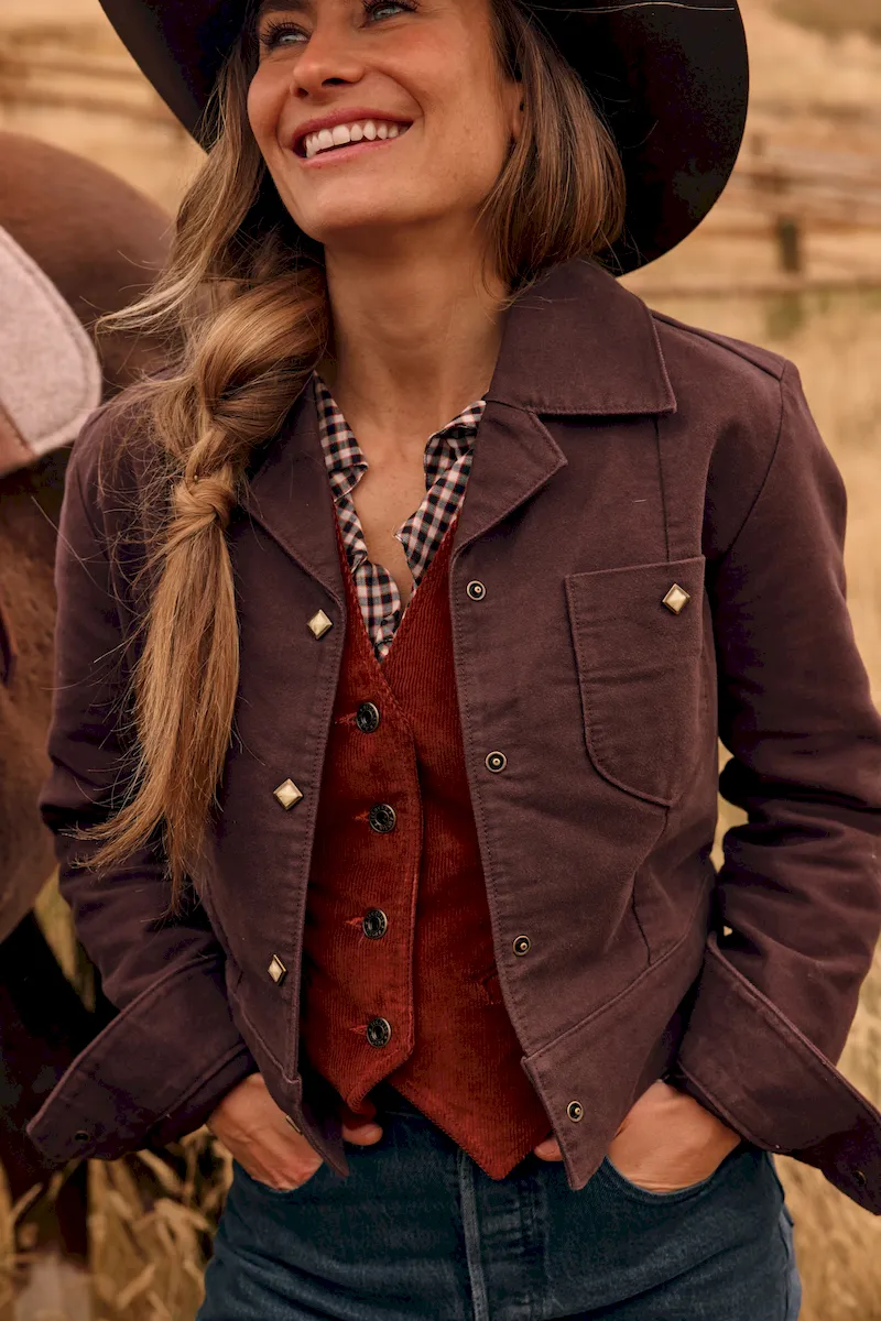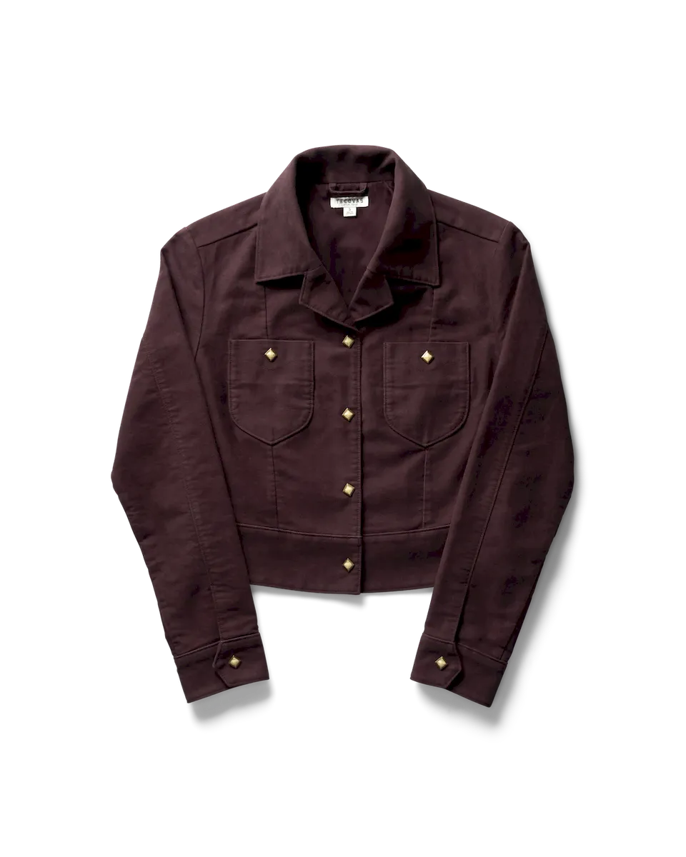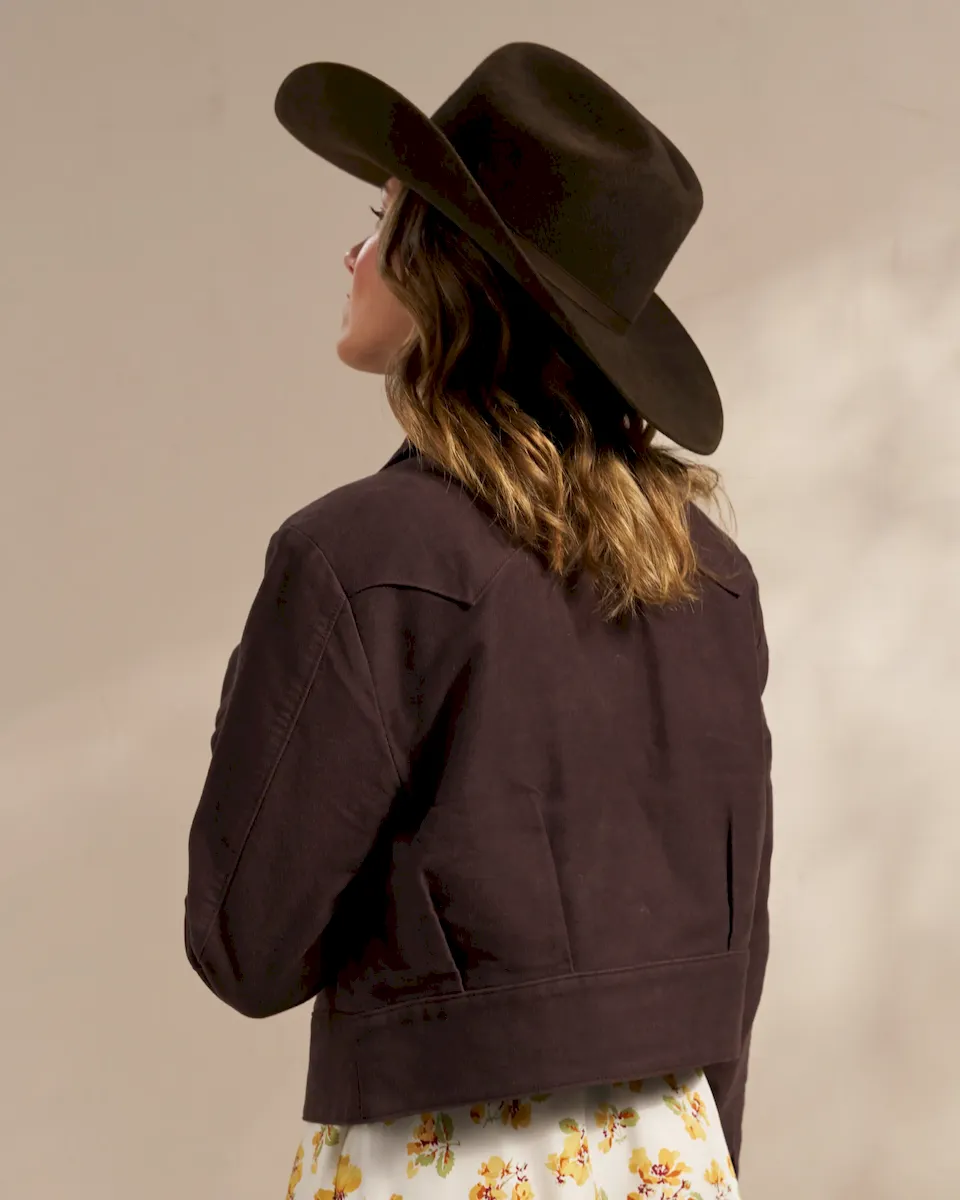 Soft, and lightweight, The Moleskin Pearl Snap Jacket is a versatile piece that will complement denim and also work as an additional layer on brisk evenings over a Western dress. A moderately cropped silhouette brings the vintage vibes and diamond-shaped, brass-accented pearl snaps only add to its nostalgic look and feel. Double-breast pockets, a pleated back, and a double-pointed yoke round out the Western details.
