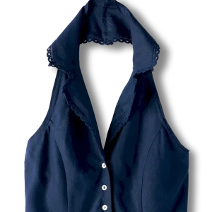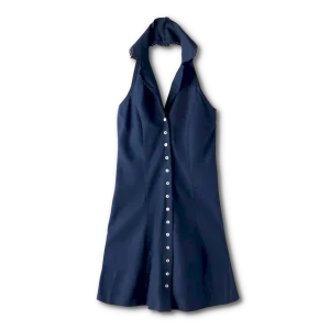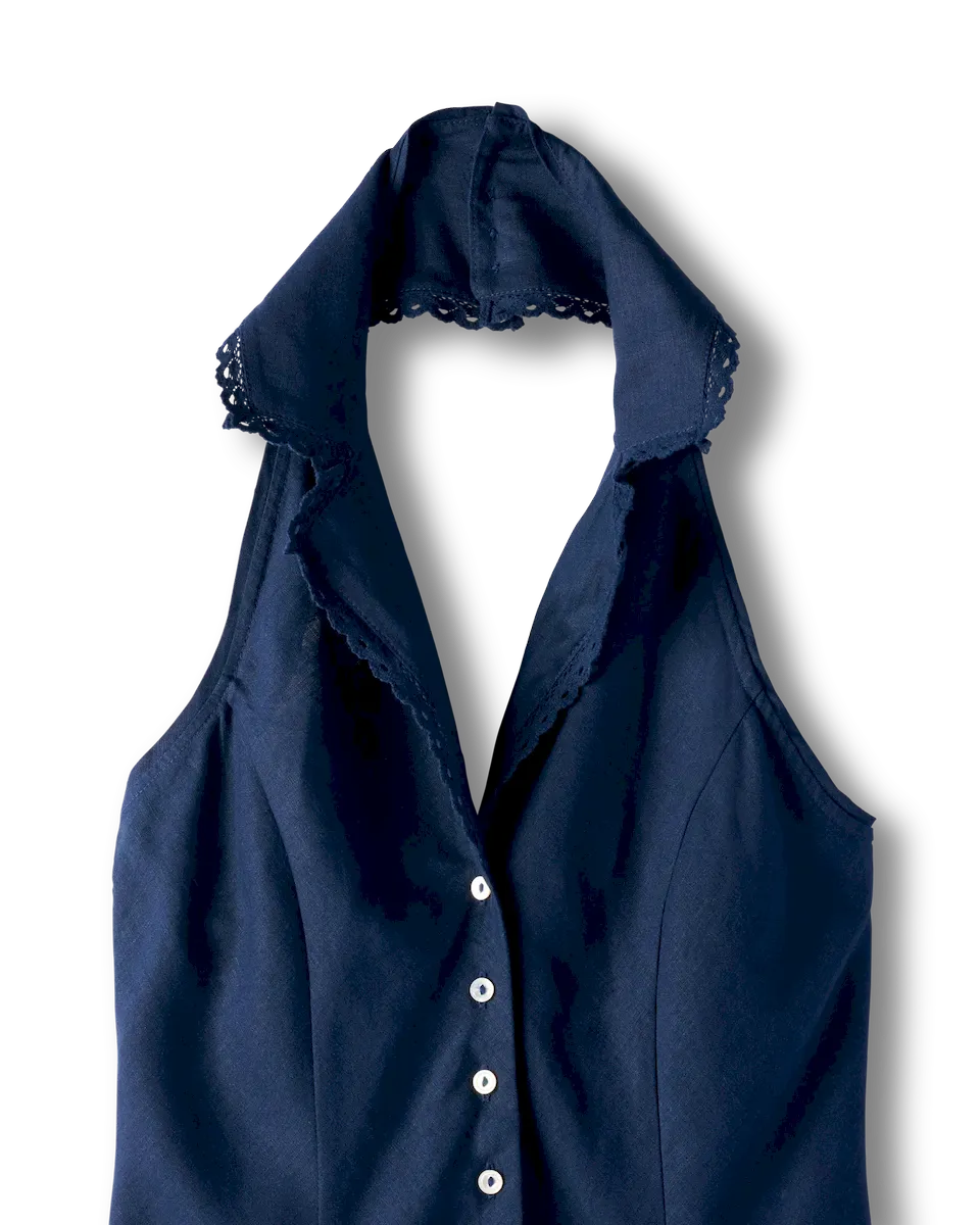 Crafted from a lightweight linen blend, this breezy silhouette is perfect for sunny adventures. The halter neckline beautifully frames the face and highlights the collarbone, while the mini length lets you show off your favorite boots. Available in two vintage-inspired custom prints, each design speaks to our Western DNA in a fresh, wearable way. The bold red spur print offers a playful nod to classic cowboy heritage, while the purple floral version adds a soft, feminine touch with intricate lace details. This dress is a go-to for any warm-weather occasion.