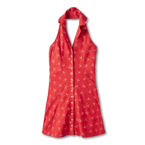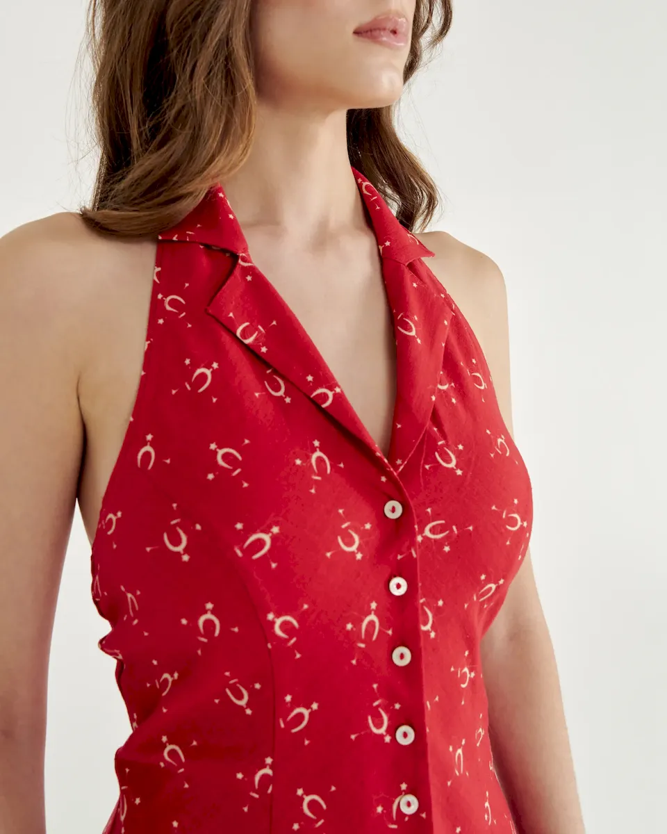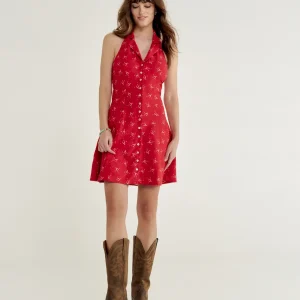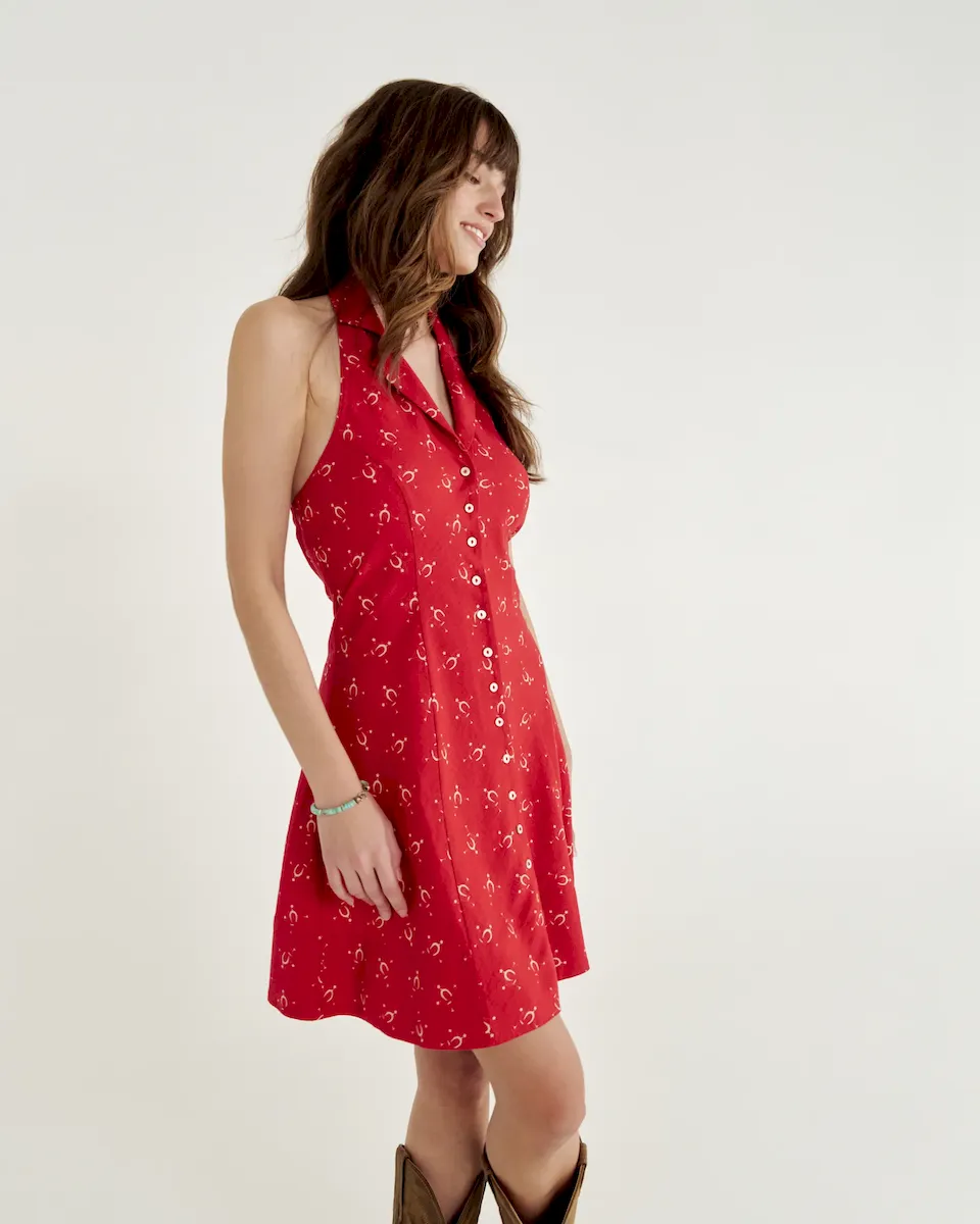 Crafted from a lightweight linen blend, this breezy silhouette is perfect for sunny adventures. The halter neckline beautifully frames the face and highlights the collarbone, while the mini length lets you show off your favorite boots. Available in two vintage-inspired custom prints, each design speaks to our Western DNA in a fresh, wearable way. The bold red spur print offers a playful nod to classic cowboy heritage, while the purple floral version adds a soft, feminine touch with intricate lace details. This dress is a go-to for any warm-weather occasion.