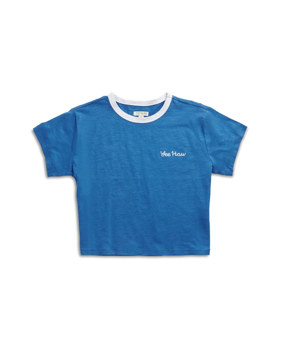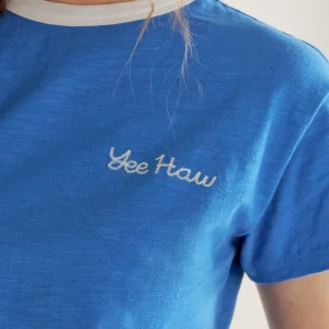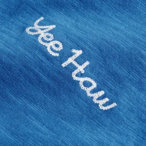 Kick up some dust in our original ringer-style tee, featuring Yee Haw front and center. Made from soft 100% jersey cotton, this everyday classic has a comfortable standard fit, contrast ribbing at the neck, and a chain stitch-inspired detail for a little extra Western flair.