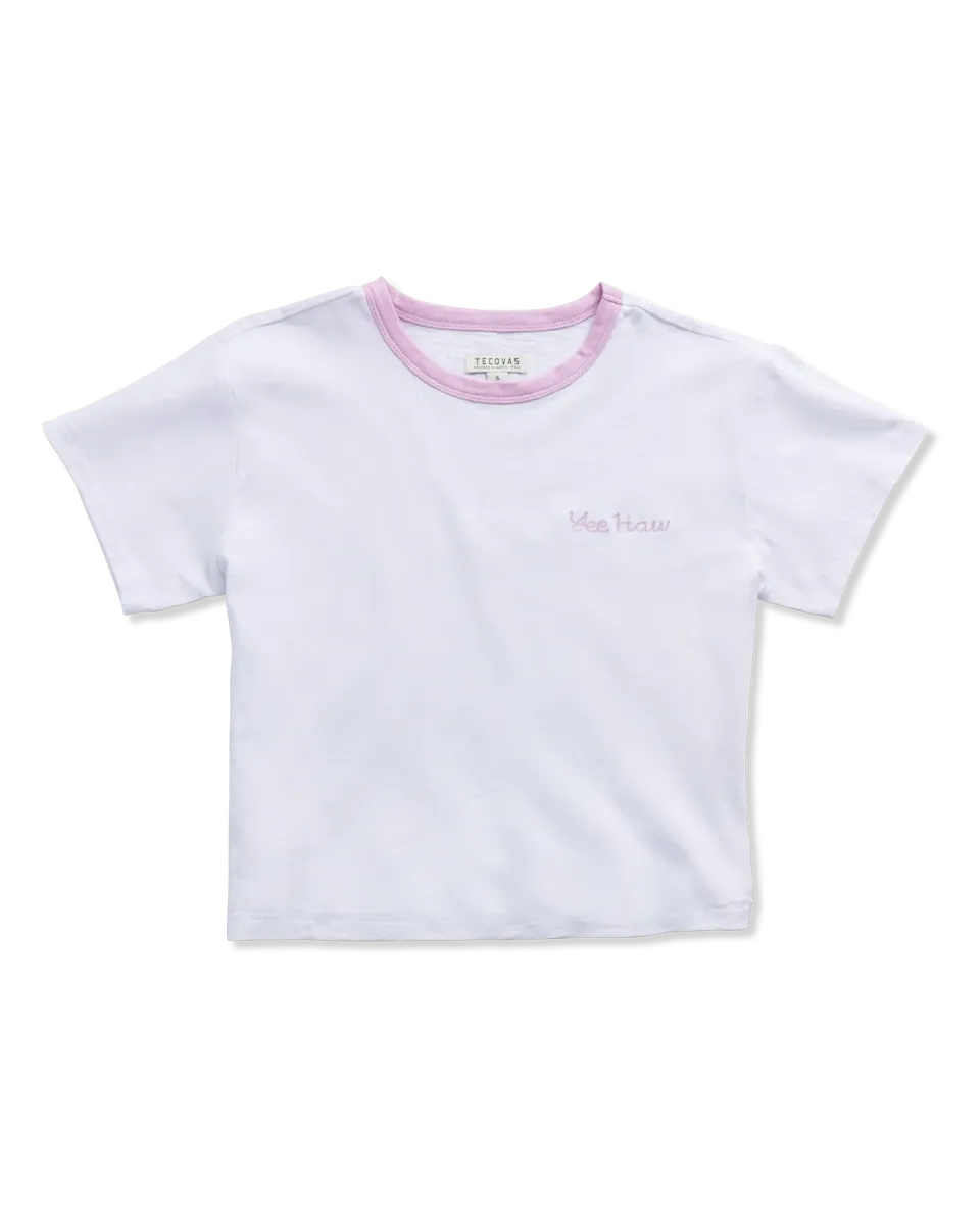 Kick up some dust in our original ringer-style tee, featuring Yee Haw front and center. Made from soft 100% cotton slub jersey, this everyday classic has a comfortable standard fit, contrast ribbing at the neck, and a chain stitch-inspired detail for a little extra Western flair.